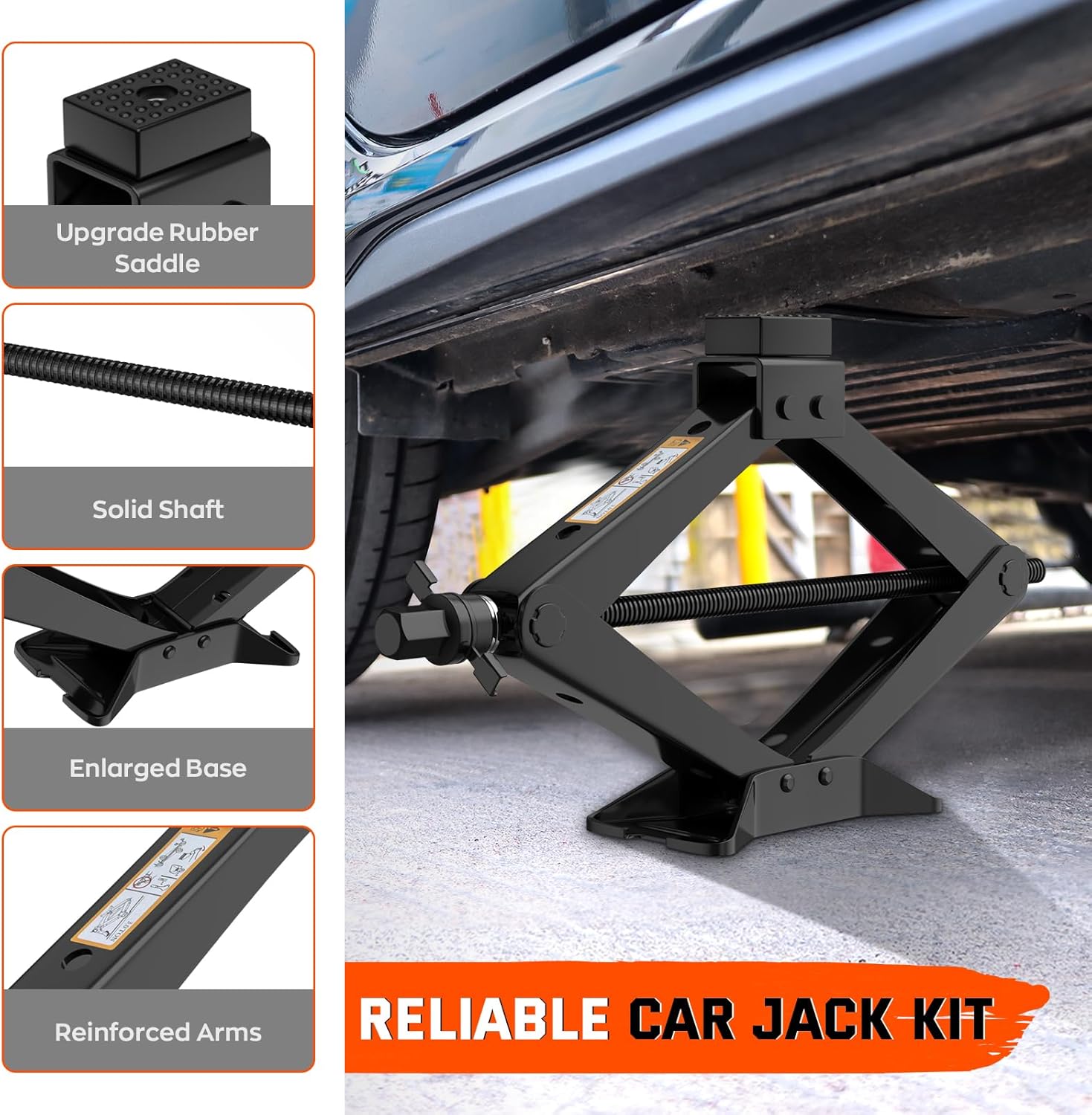 - 👍【Universal Car Emergency Kit】This car jack kit is universally compatible with cars, SUVs, MPVs, and other vehicles. It is perfect for emergency situations where you need to change a flat tire, remove a stuck wheel, or perform other vehicle repairs.