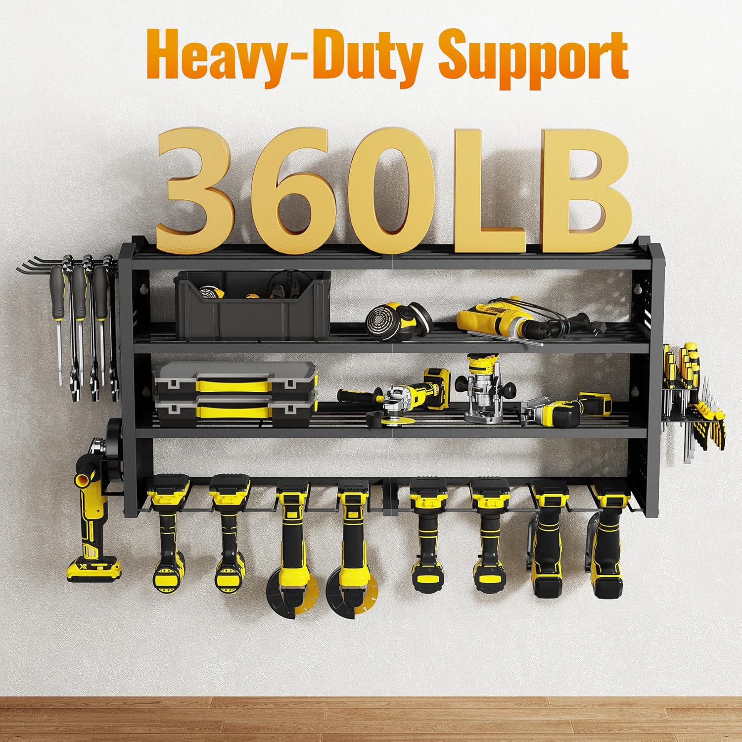 - Versatile & Space-Saving Storage: This tool organizer is designed for maximum adaptability, accommodating toolboxes, power tools, and maintenance accessories. Equipped with side hooks and partition boards, it efficiently utilizes vertical space. Ideal for garages, workshops, and various storage areas, it mounts securely on pegboards, concrete walls, and more.