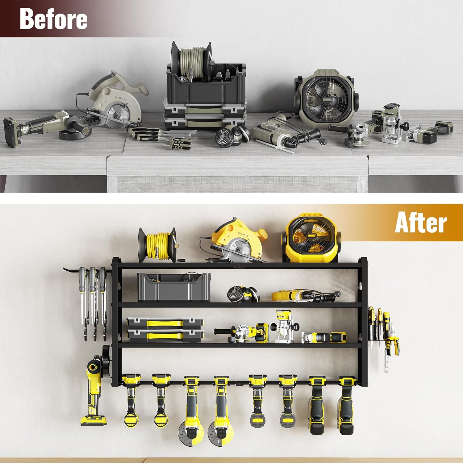 - Expandable & Efficient Organization: Featuring a multi-layer adjustable shelf design, this tool holder is taller and wider than standard models. It allows for customizable space allocation, fitting tools of different sizes while keeping your workspace clutter-free and easily accessible.