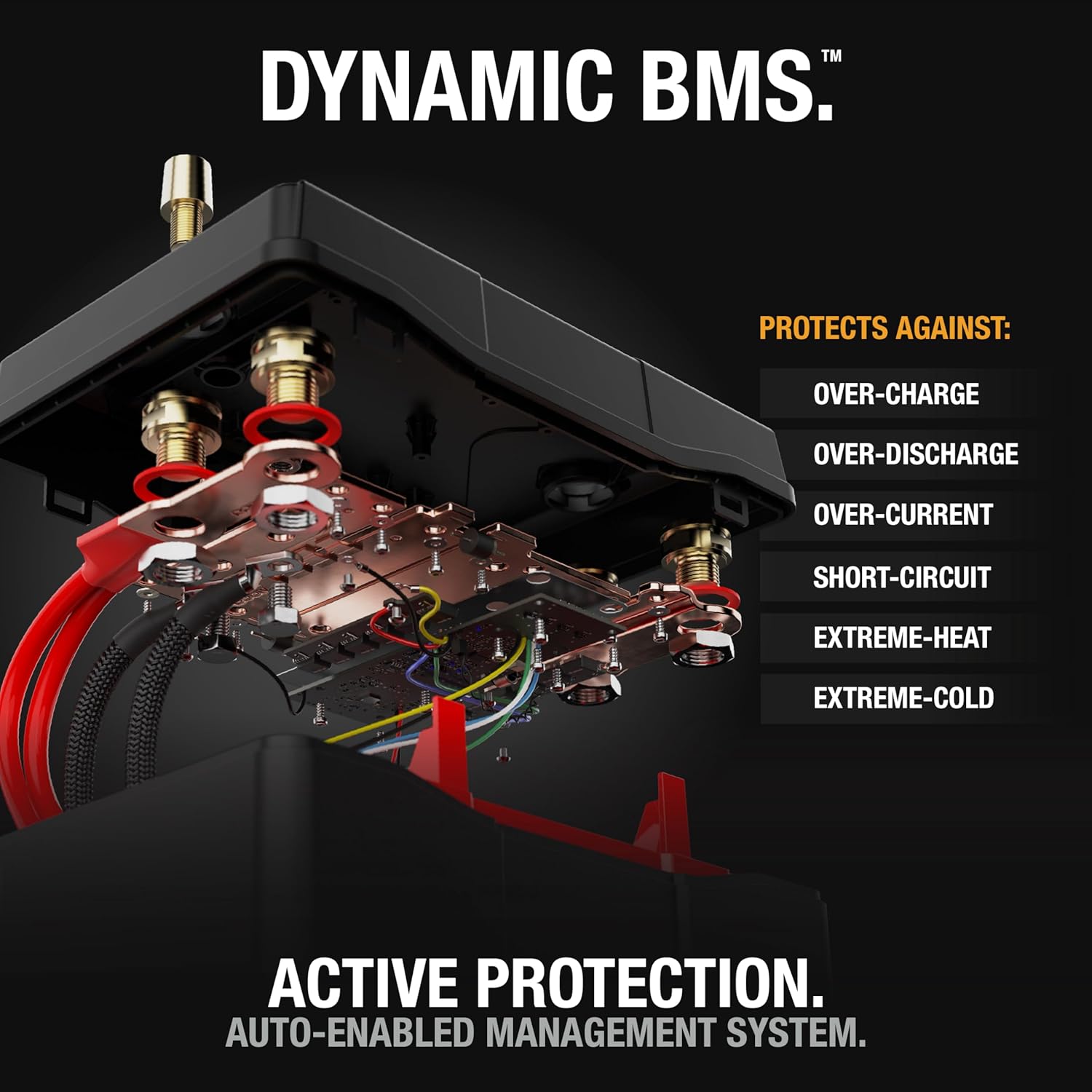 - DYNAMIC BMS — Built-in battery management system ensures safety and reliability with bidirectional cell balancing and protection from overcharge, overdischarge, short circuits, and more - plus active thermal monitoring with no resets required.