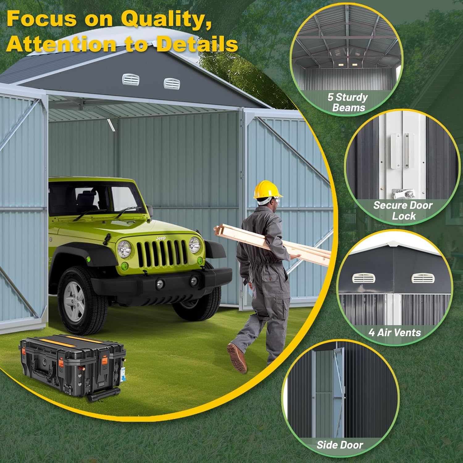 - Enhanced Ventilation and Illumination: Designed with four essential vents integrated into the wall, this metal garage shed optimizes both light and ventilation. The tilted roof and lockable door contribute to odor prevention and moisture reduction. Additionally, the sloping roof design effectively prevents rainwater pooling, thus minimizing the risk of rust formation.