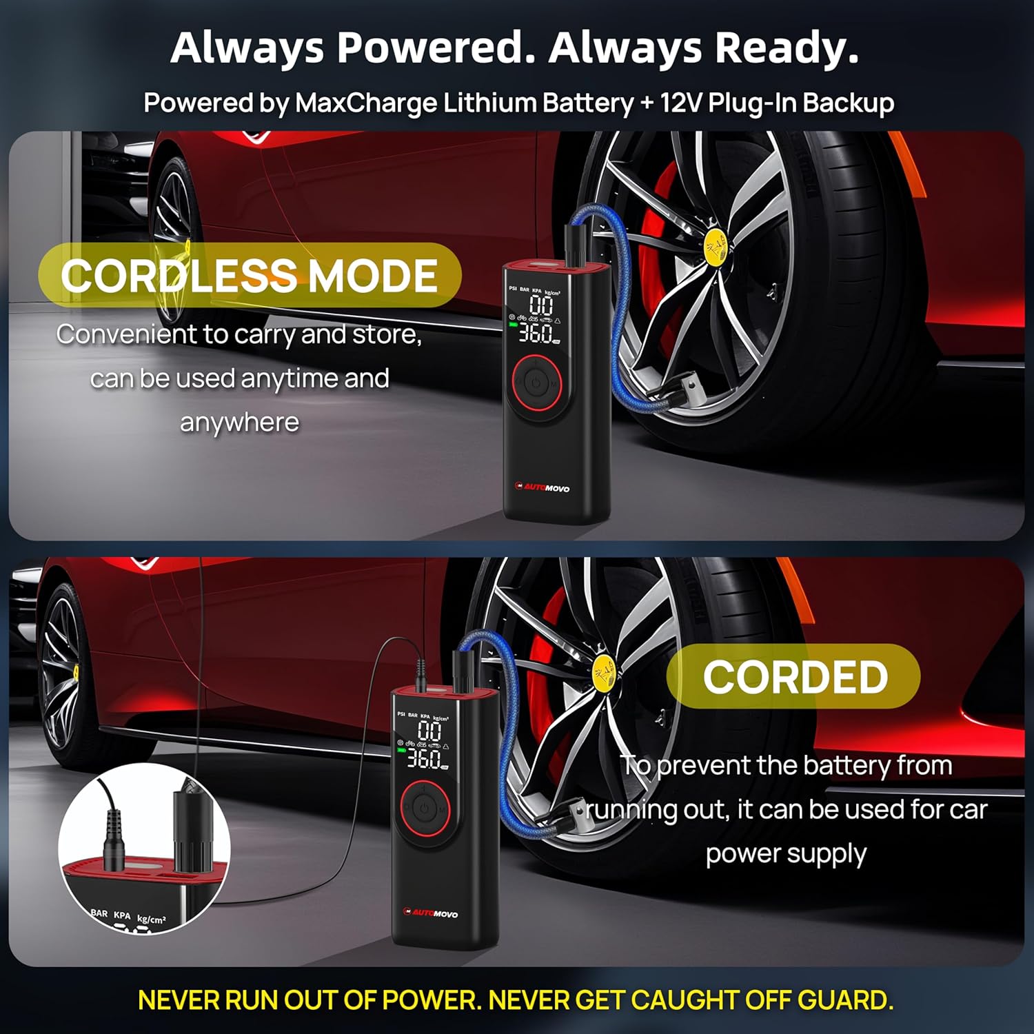 - Air inflator pump equipped with high-performance chip and powerful motor, with max pressure of 150 PSI, plus 35L/min airflow, which increases the inflation speed by 3X faster, it can inflate 195/65R15 tires from 29 PSI to 35 PSI in less than 1 minutes with auto-shut off function