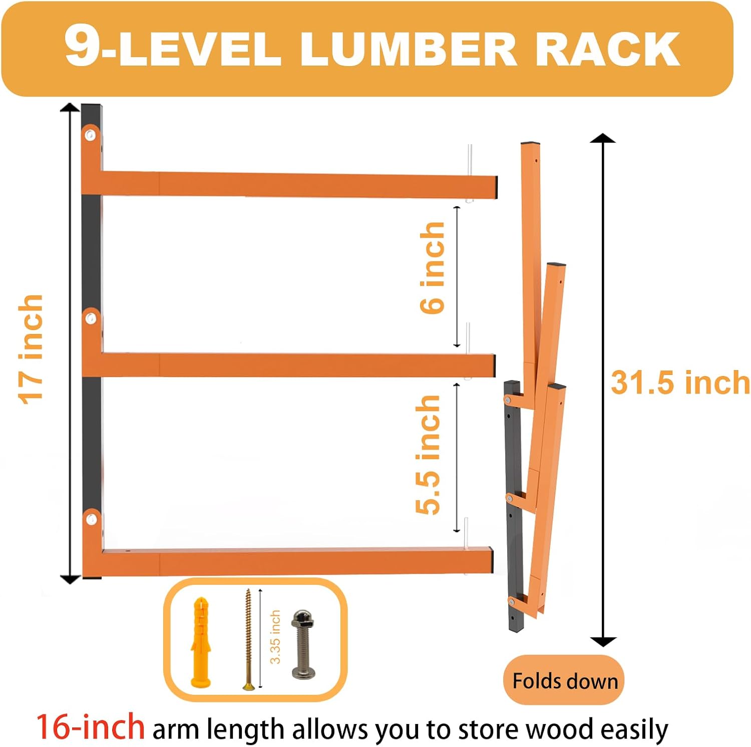 Lumber Rack Wall Mount, Heavy Duty Wood Storage Racks, 9-Level System Garage Shelving, 1080 Lbs Capacity Organizer Shelves, Folding Orange Brackets, 6 Pack Hanging Metal Shelf for Indoor and Outdoor