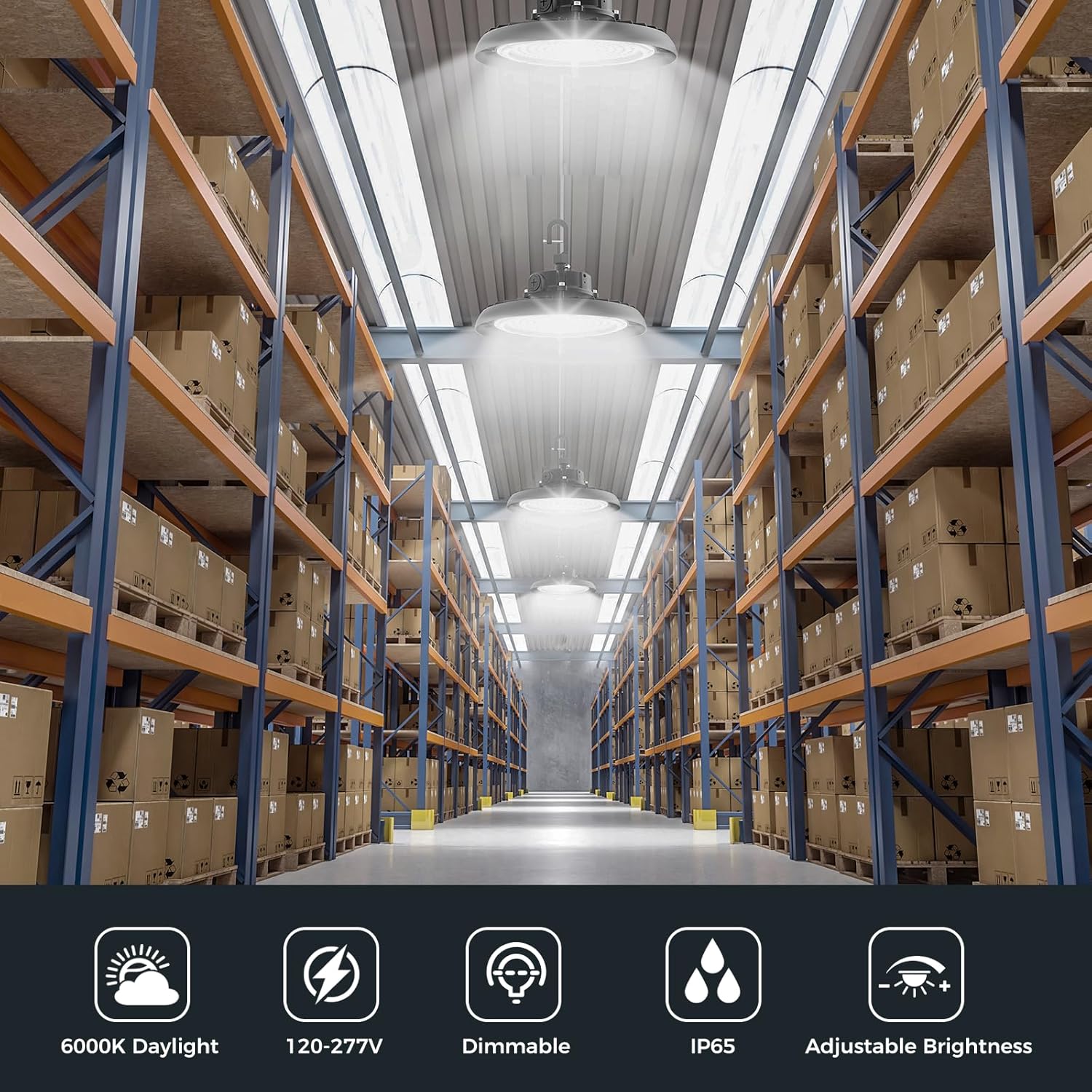 - Wide 120° Beam – Uniform, Shadow-Free Lighting - Equipped with a 120° beam angle, this UFO high bay light ensures wide, even coverage for ceilings 12–16 feet high, lighting areas up to 38 feet wide. Say goodbye to dark spots—perfect for commercial, industrial, or retail spaces that demand consistent illumination.