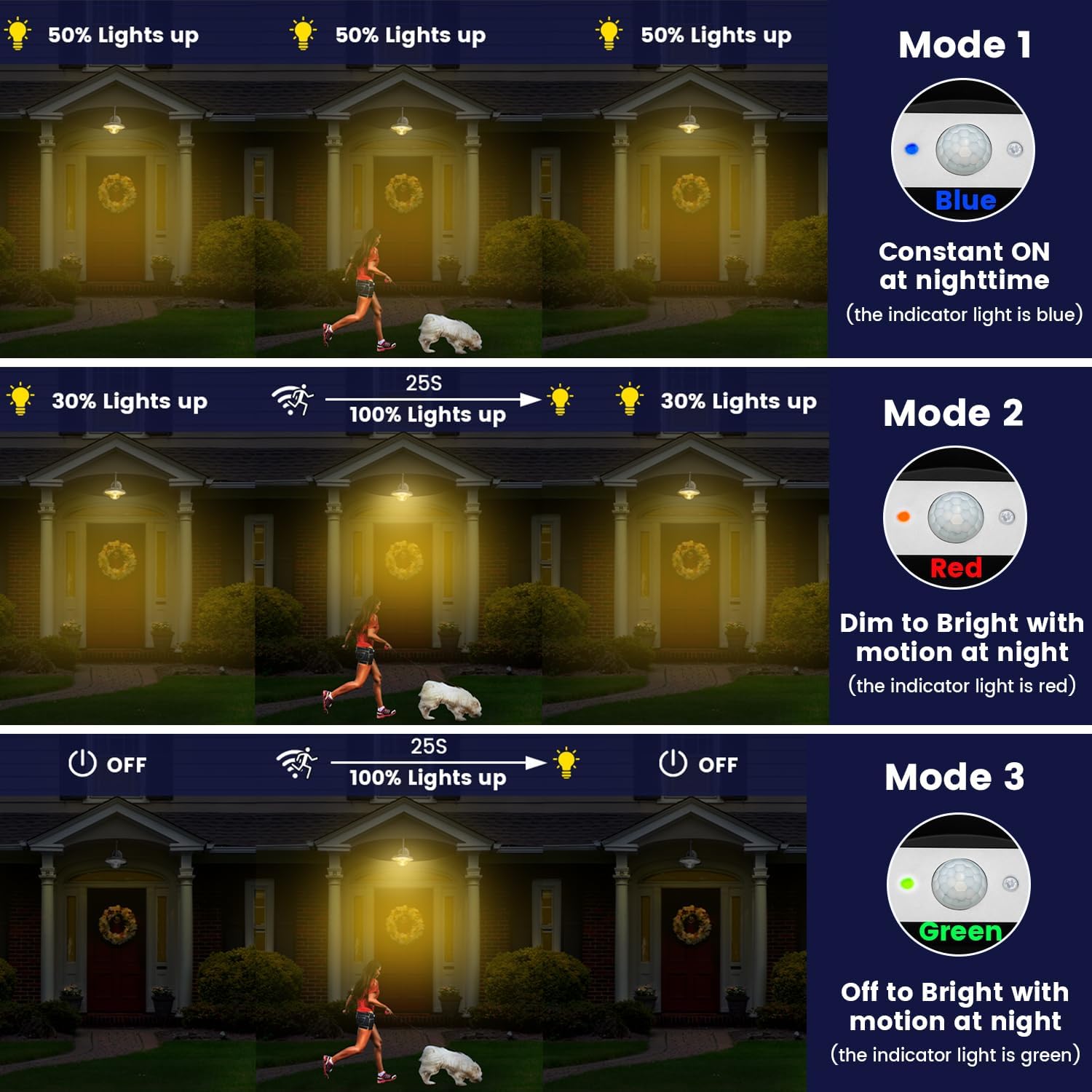 - [3 Modes & 2 Lighting] Choose between warm (3000K) and cool white (6000K) lighting. This farmhouse barn light offers three sensor modes: Constant on, dim to bright, and off to bright. Easily toggle between sensor modes and lighting settings with the "remote" or "mode" button.