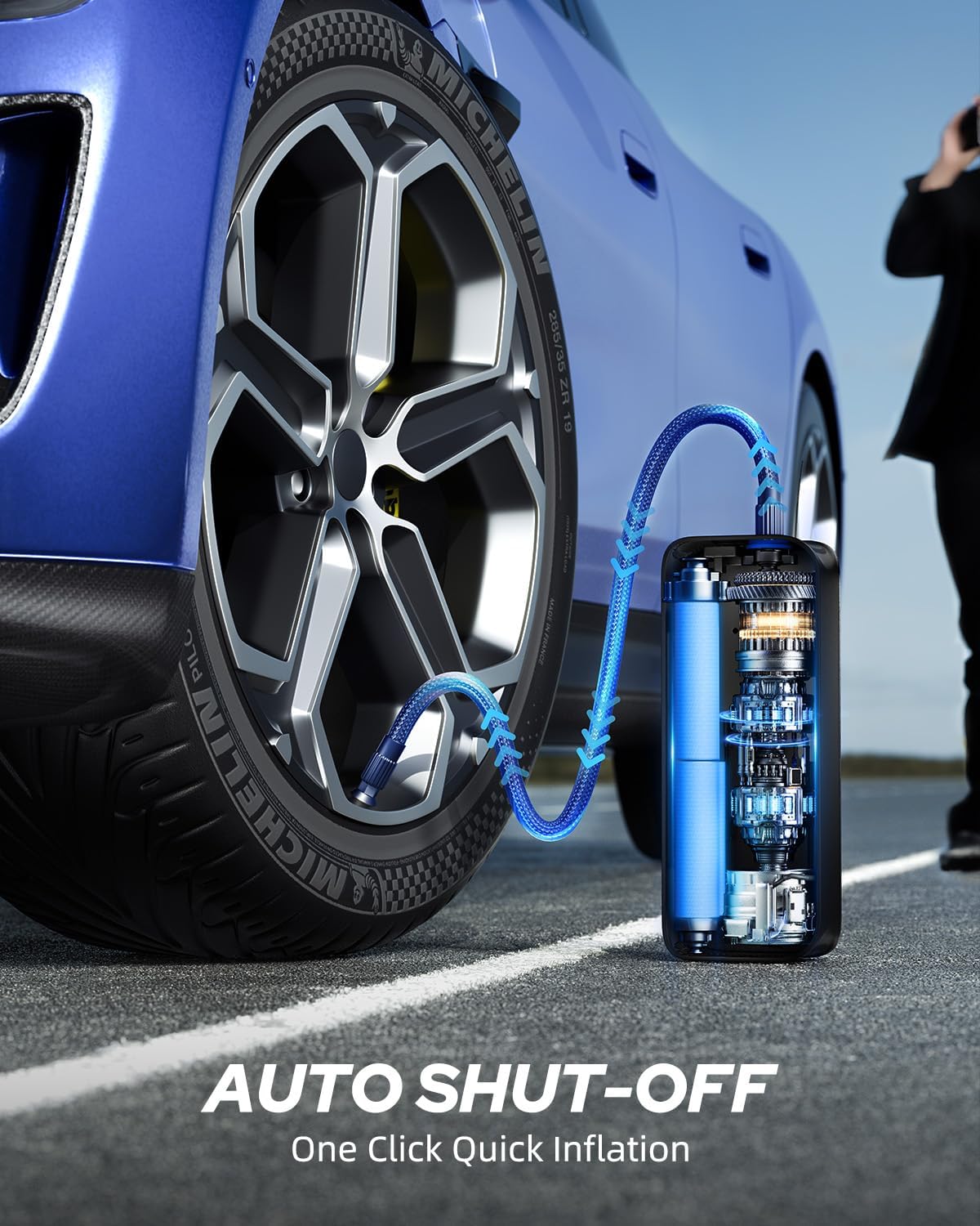 - Convenience to Inflate from Any Angle: Portable tire inflator built in 7800mAh powerful rechargeable battery with an 19.7 inch upgraded anti-scalding and high-pressure hose for cordless convenience. Whatโs more, 12V car power adapter is also available(11.5 FT long wire to cover whole car), providing uninterrupted inflation at any time