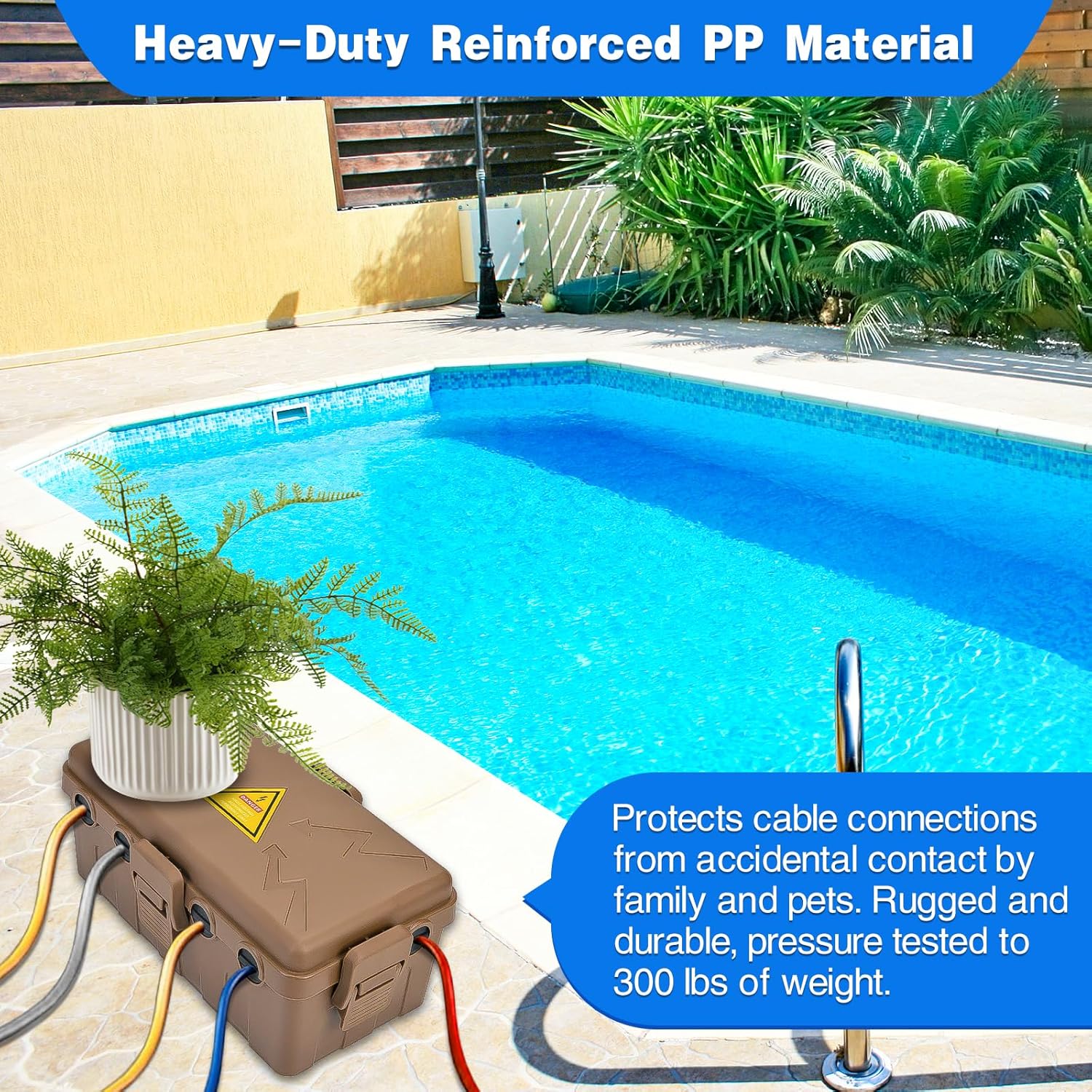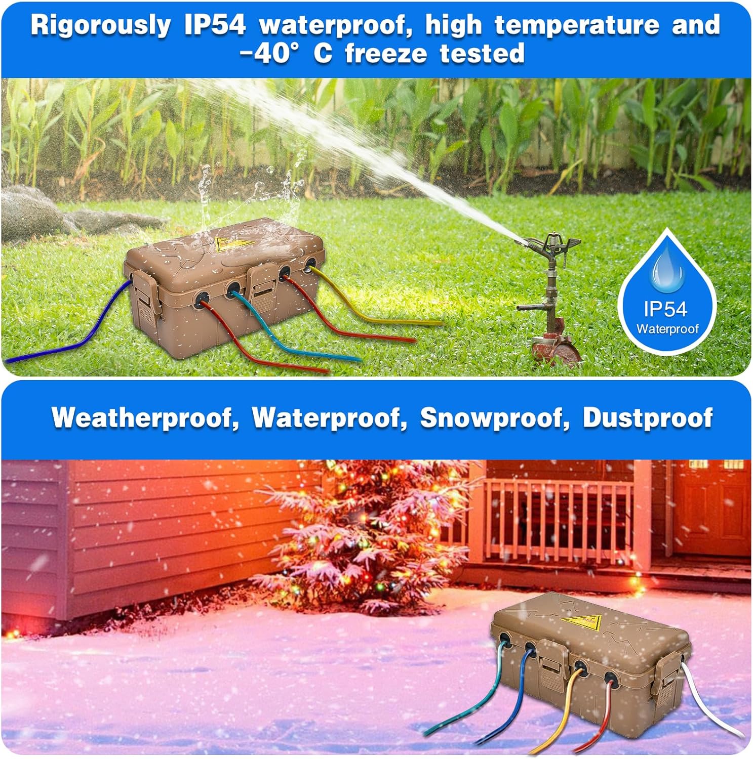 • WATERPROOF TIPS:Place the electrical box parallel to the ground, do not place it vertically or obliquely; Do not submerge the box in water or bury it in the ground; Each package only includes 1*outdoor electrical box. The power strip, surge protector, outdoor timer, extension cord and all other device are not included.
