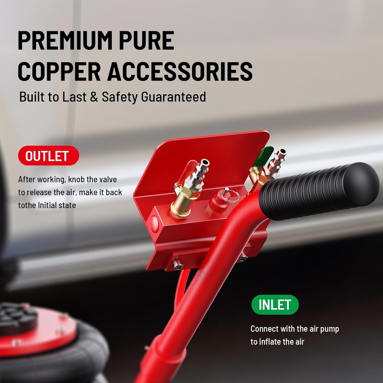 - Quick Lifting: Simply connect to an air compressor, and with a push of the valve, lift your vehicle in just 3-5 seconds. Fast, effortless, and time-saving—perfect for quick maintenance or repairs.