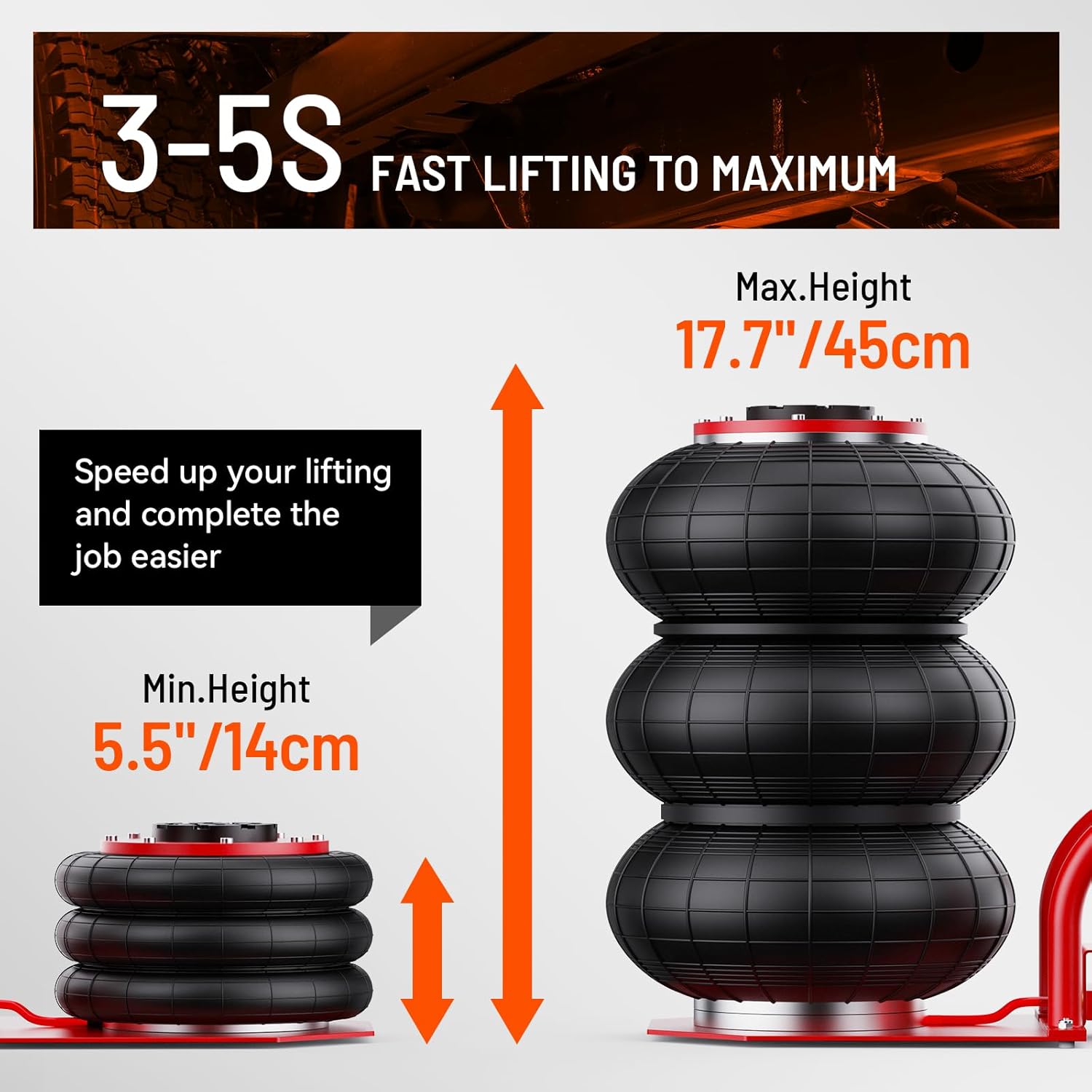 - Wide Lifting Range: Effortlessly lift vehicles of various sizes with our pneumatic jack's impressive range of 5.5–17.7 inches. Whether you're working on low-profile cars or taller SUVs, this car jack provides the flexibility you need for smooth, efficient repairs.