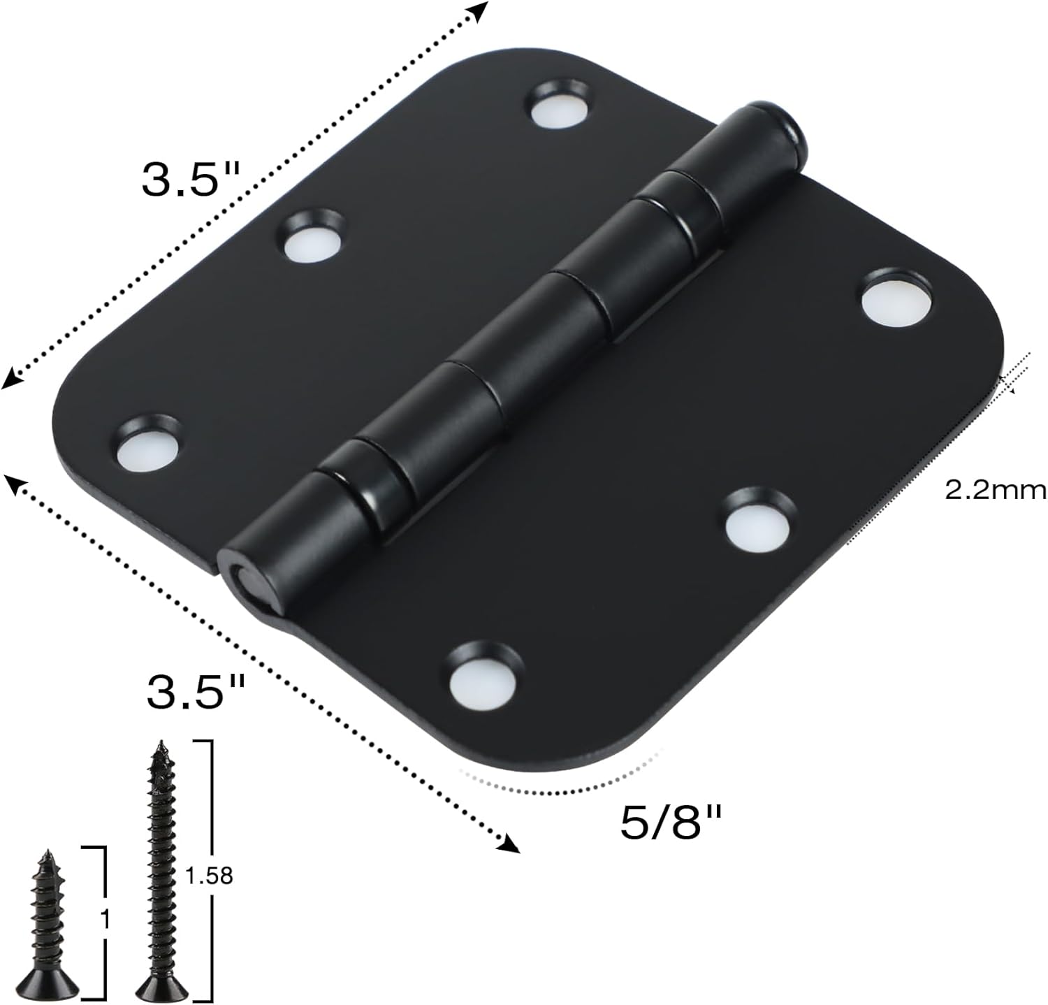 - Door hinges Black Matte 3.5 inch with 5/8 rounded corners and 6 holes for front door, cabinet, wooden box. Safe black door hinges 3.5" includes 144 free screws for quick and easy installation. Mat black door hinges can be rotated 270 degrees. The extra long screws will come in handy specially when replacing existing hardware using the same hole pattern.