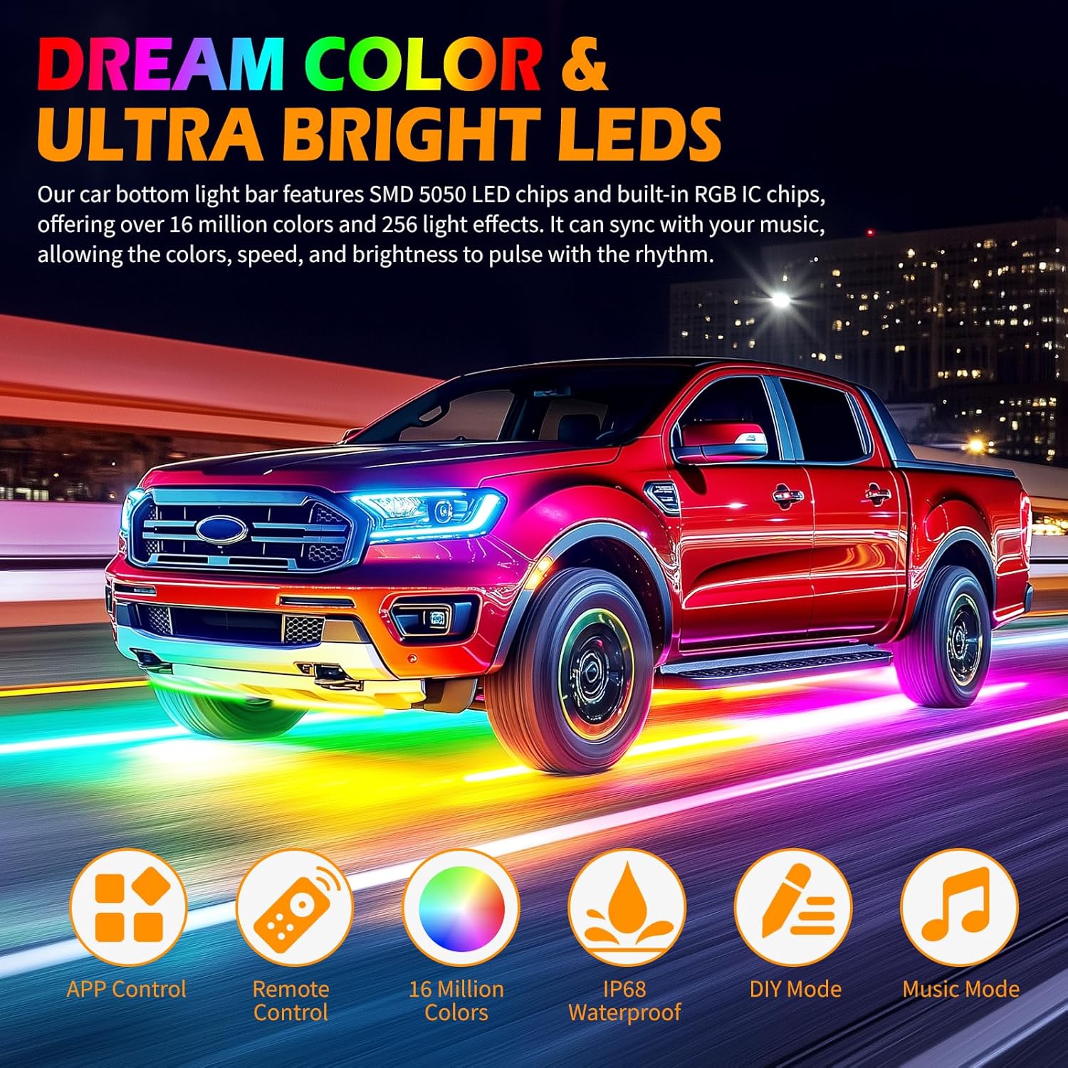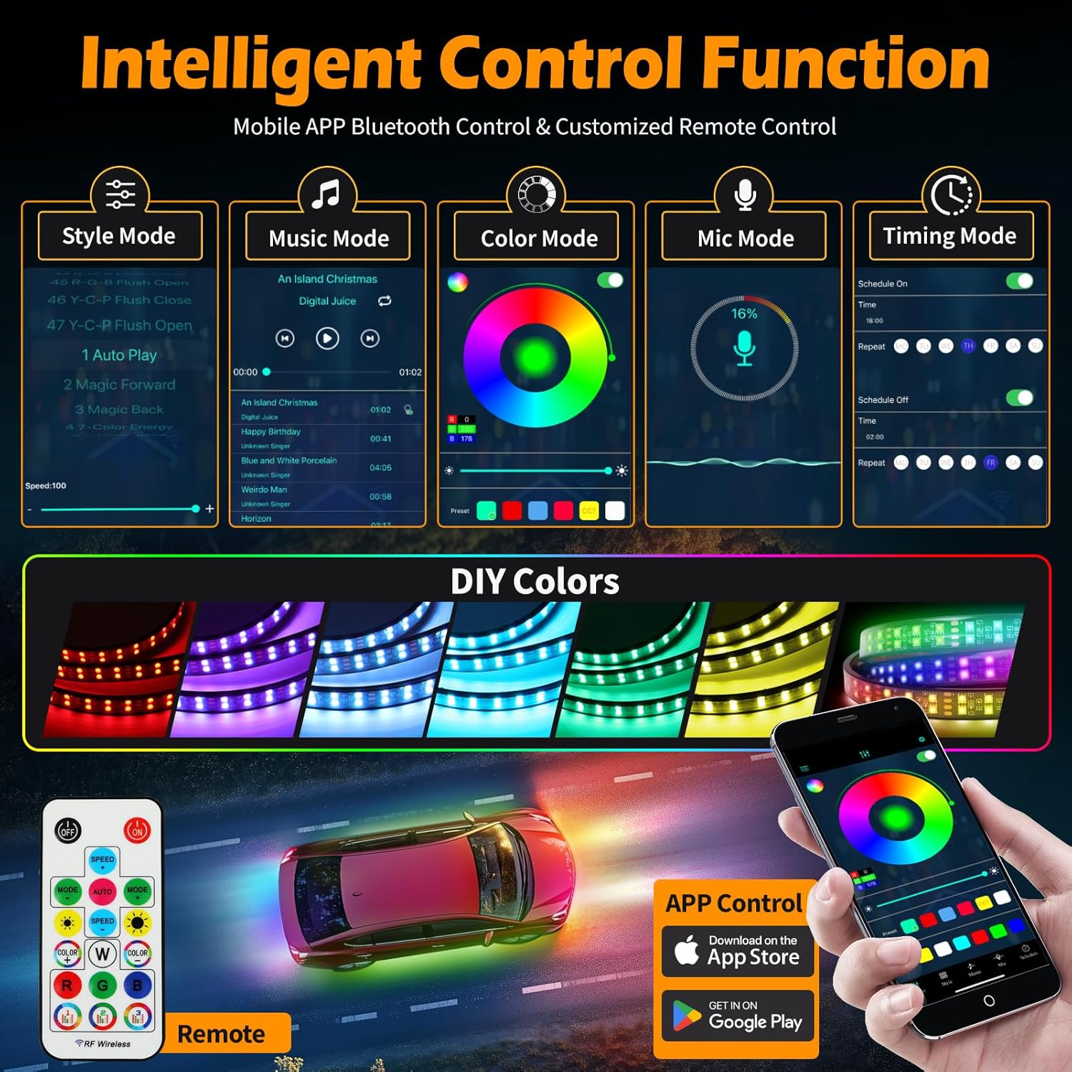 - ăBluetooth & Remote Controlă:The underglow kit for trucks with mobile Phone APP Control, phone control direct, control range up to 20 meters; The app control has 5 functional modes: Multi-color-DIY ; Music Mode; Rhythm; Function Mode Option; Timing Function.Car underglow light with over 16 million colors for you to enjoy and indulge, DIY lighting effects, Music sync, Multi-color Mode with adjustable brightness, such as Colorful gradient