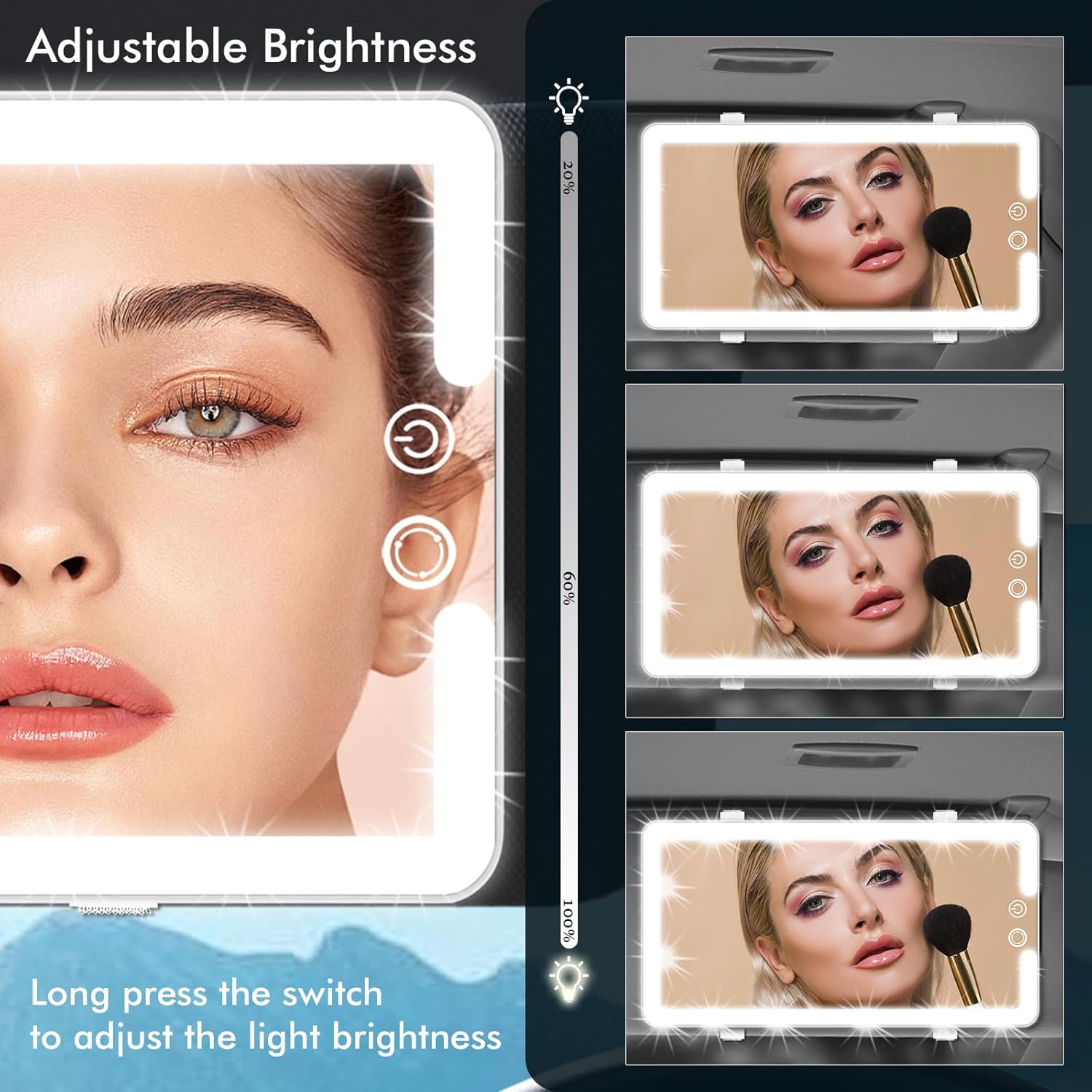 - ăClear visibilityă Our makeup mirror for car visor are large, high-definition mirrors with a wide field of view. This makes it easier to groom your eyebrows, apply eyeliner, or apply full facial makeup with precision and clarity. The mirror's distortion-free surface ensures you see a true reflection of your face, helping you achieve perfect makeup results every time.