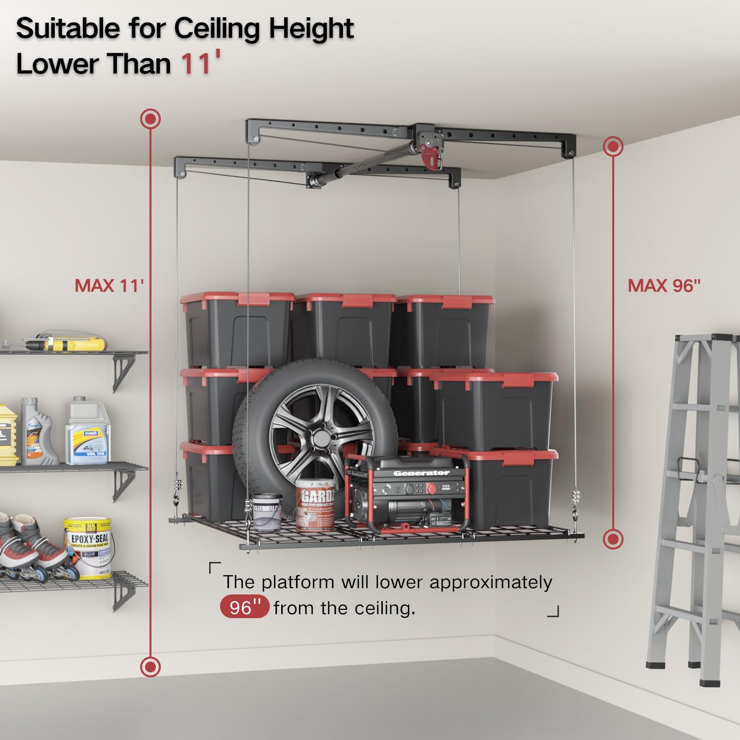 - Maximize Garage Storage Space & Height Compatibility: Get 16 sq feet of additional overhead storage space with our garage hanging storage rack. Suitable for ceilings up to 8-11 FT high, and the platform can be lowered approximately 96 inches (8 FT) from the ceiling, making it ideal for both low and high garage spaces. Perfect for those who need extra shelving but donโt have the floor space.
