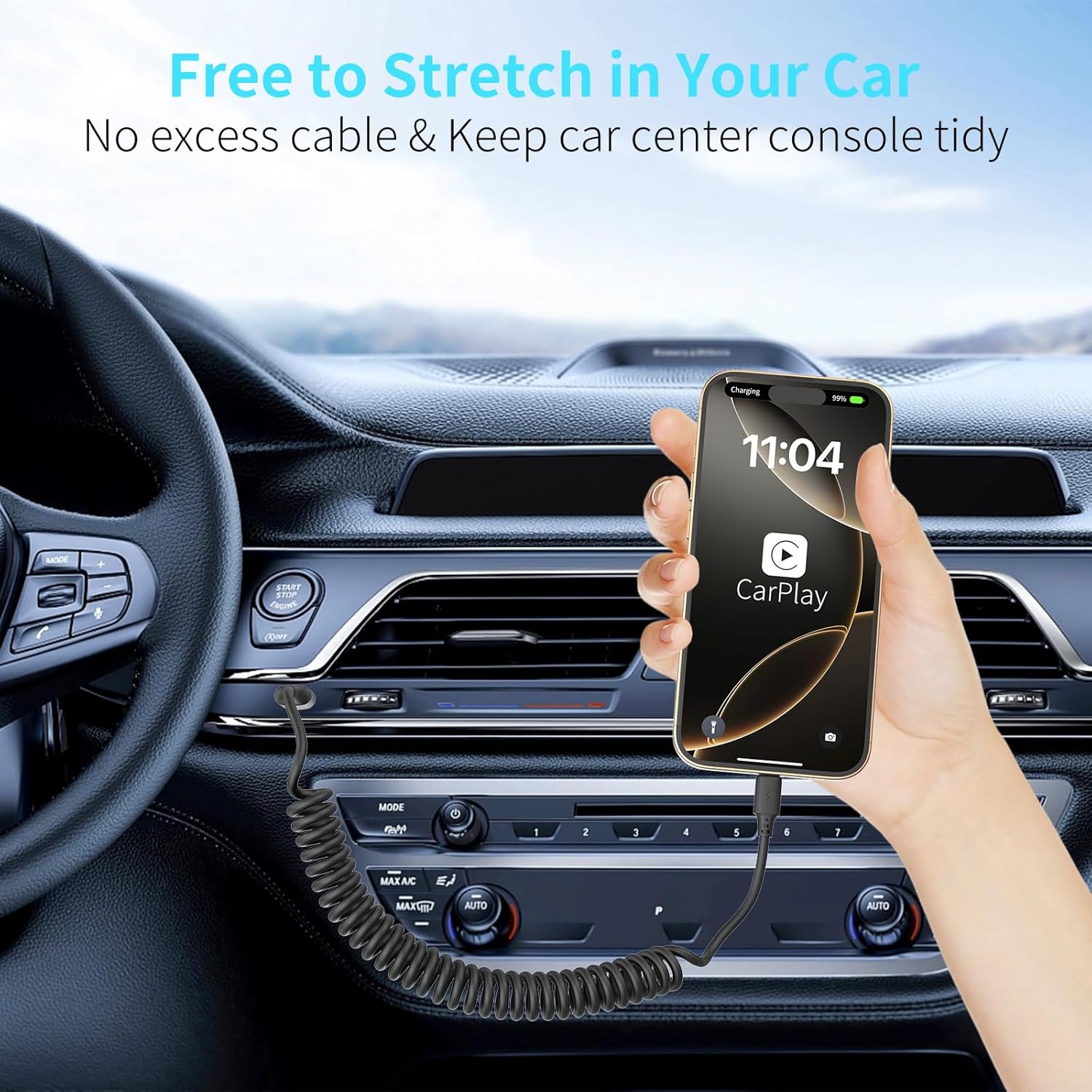- Coiled USB C Cable for Car: 1FT usb c cable coiled (stretchable to 3FT, comfortable stetch length 1.5ft-2ft). USB to usb c cable for car can well save the use of space in the car and say goodbye to the hassle of cable clutter and tangles, and easy to carry