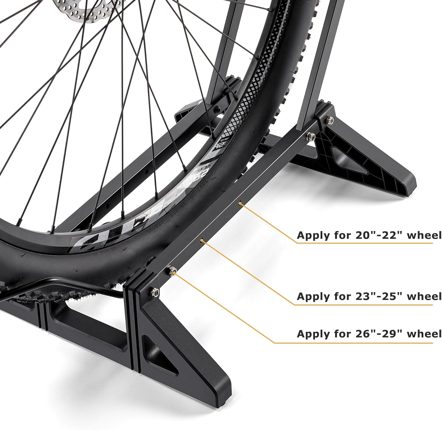- 【ULTRA STURDY FRAME】- Crafted with high strength steel & ABS material, the bicycle rack features great toughness and hardness. The Wide ABS base and high-quality steel frame can firmly hold heavy bikes without shaking and deformation. Besides, with a powder finish, the bike floor stand is rust-resistant for long-term use.