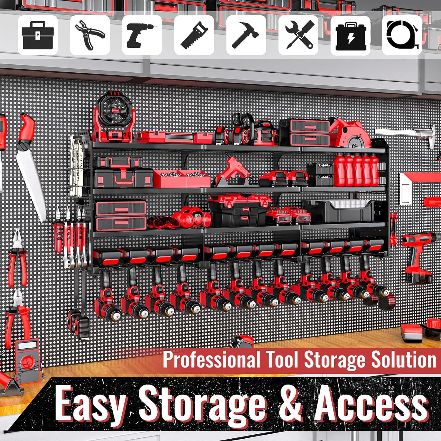- 【 12 Drills Holder High-capacity Storage】This power tool organizer uses the latest four-tier high-capacity design. The bottom layer can store 8 cordless drills, the upper three layers can store other heavy tools or various small tools, and a hammer holder, pliers holder and screwdriver holder are added to the side.providing you a neat and efficient workbench!