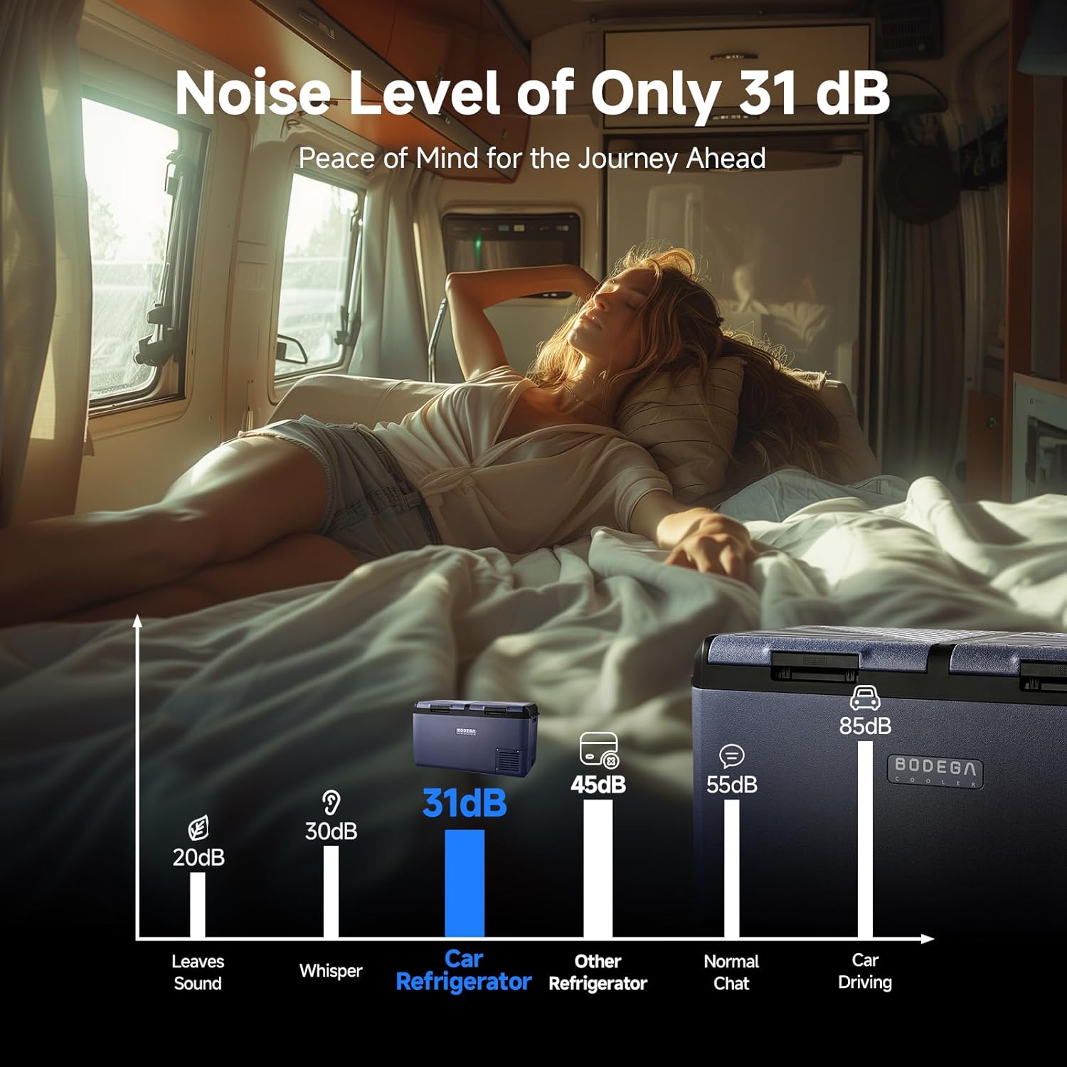 - 【ANTI-SHAKING CAR FREEZER】BODEGACOOLER 12v fridge provides a silent and comfortable environment for you.Because of its overall external smooth lines and equipped with a multi-functional non-slip base, the lateral displacement is greatly reduced. When your car is climbing at an inclination angle of 45 degrees, the car portable freezer can still run stably.Our portable car refrigerator allows you to enjoy cold drinks in stable and quiet during the trip.