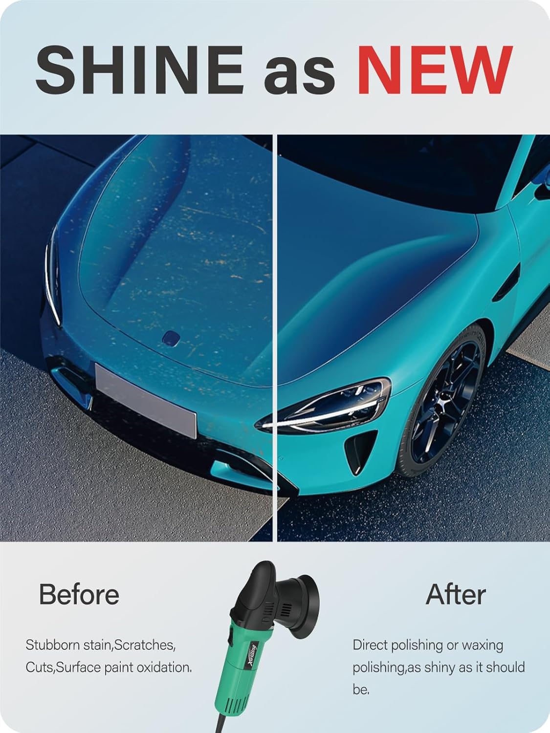 - Wide Application: The orbital random auto polisher has a wide range of applications that the polisher can use for car polishing and waxing; car detailing; floor polishing; gutter polishing; metal polishing; wood polishing; tile polishing, and so forth
