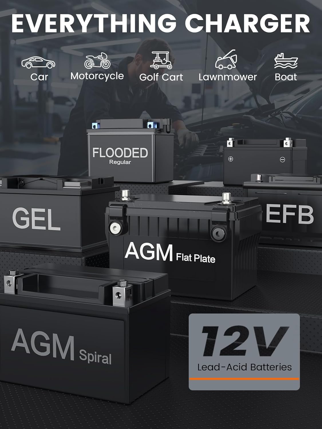 - COMPATIBILITY: Designed for ALL 12V lead-acid batteries: AGM, GEL, SLA, Flooded, Deep Cycle, Marine and so on. Supports cars, motorcycles, boats, ATVs, SUVs, RVs, trailers, lawnmowers, mopeds, classic cars, and more. Whether you're testing or chargingâitâs the one tool for every job