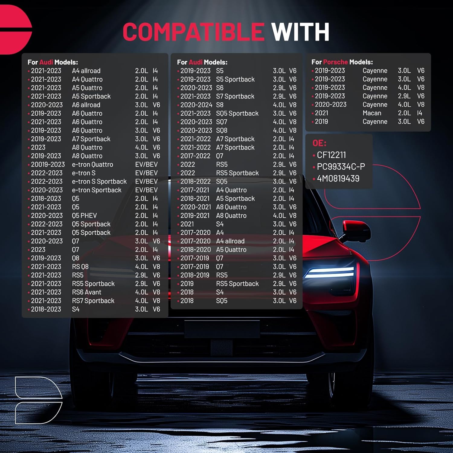 - [Vehicle Fitment] Compatible with Audi A4 allroad/A4 Quattro/A5 Quattro/A5 Sportback/A6 Quattro/Q5/RS Q8/RS5/RS5 Sportback/RS7 Sportback/Q5 Sportback/S7 Sportback/RS6 Avant/SQ5 Sportback 2021-2023; A6 Quattro/A7 Sportback/A8 Quattro/e-tron Quattro/A6 Quattro/Q8/S5/S5 Sportback/ 2019-2023; Q5/S4 2018-2023; SQ5 2018-2022; A5 Sportback 2018-2021. Please check the OE No.: CF12211, PC99334C-P, 4M0819439