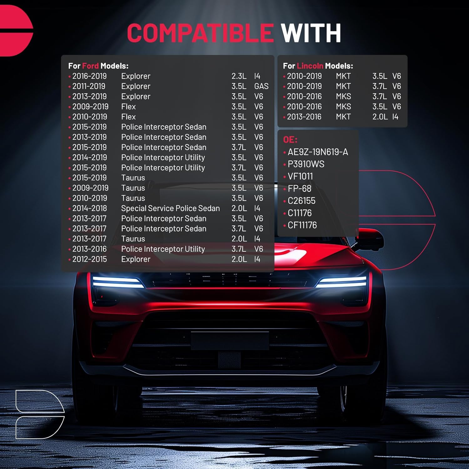 - [Vehicle Fitment] Compatible with Ford Explorer 2011-2019, Flex 2009-2019, Police Interceptor Sedan 2013-2019, Police Interceptor Utility 2013-2019, Special Service Police Sedan 2014-2018, Taurus 2009-2019; Compatible with Lincoln MKT 2010-2019, MKS 2010-2016