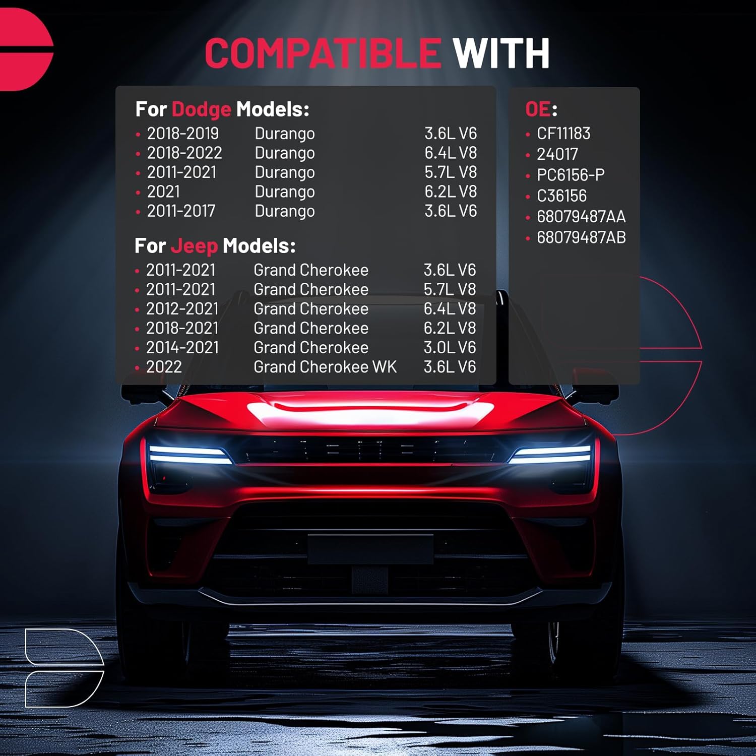 - [Vehicle Fitment] Compatible with Dodge Durango 2011-2019 3.6L V6, Durango 2011-2021 5.7L V8, Durango 2021 6.2L V8, Durango 2018-2022 6.4L V8; Compatible with Jeep Grand Cherokee 2011-2021 3.6L V6/ 5.7L V8, Grand Cherokee 2018-2021 6.2L V8, Grand Cherokee 2012-2021 6.4L V8, Grand Cherokee 2018-2021 6.2L V8, Grand Cherokee 2014-2021 3.0L V6, Grand Cherokee WK 2022 3.6L V6
