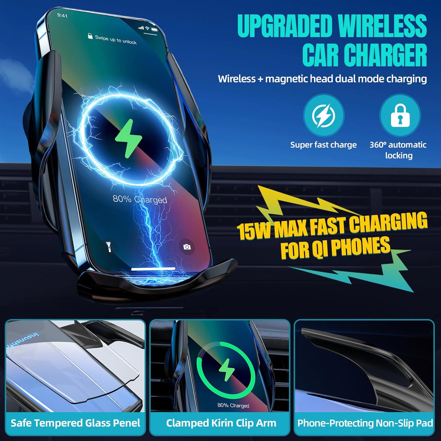 Wireless Car Charger, MAX 15W Fast Charging Auto Clamping, Sensing Phone Holder Mount, fit for iPhone 16 15 14 13 12 Pro Max Xs X, Samsung Galaxy S24 Ultra S23 S22 S21 S20 Note20 (2-Black)