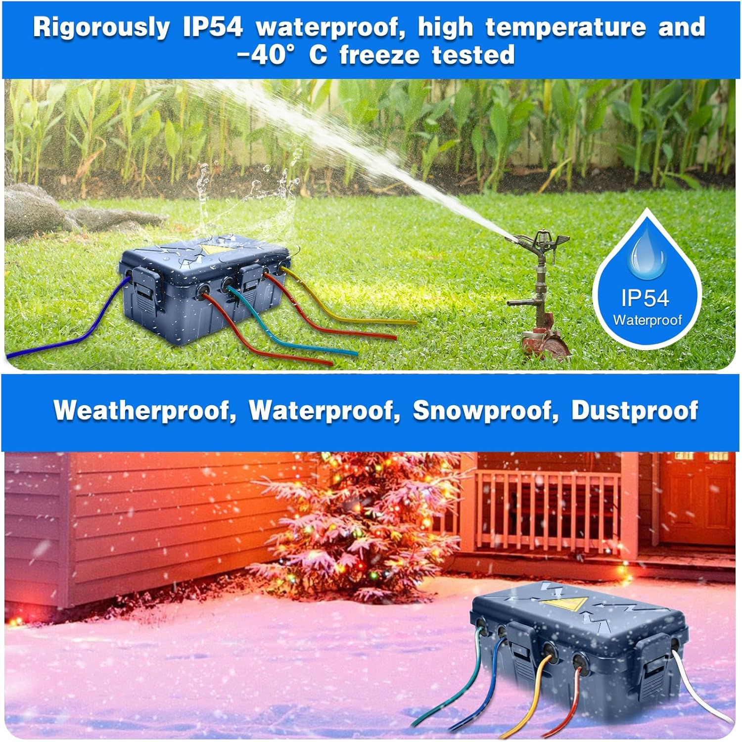 - IP54 WATERPROOF: Made of heavy-duty reinforced PP material, it is rigorously tested to IP54 waterproof, high temperature and -40℃ freezing, can withstand up to 300 lbs. and is resistant to rain, water, snow, dust, dirt.Suitable for protecting outdoor power outlets, row plugs, timers, extension cords, adapters etc.