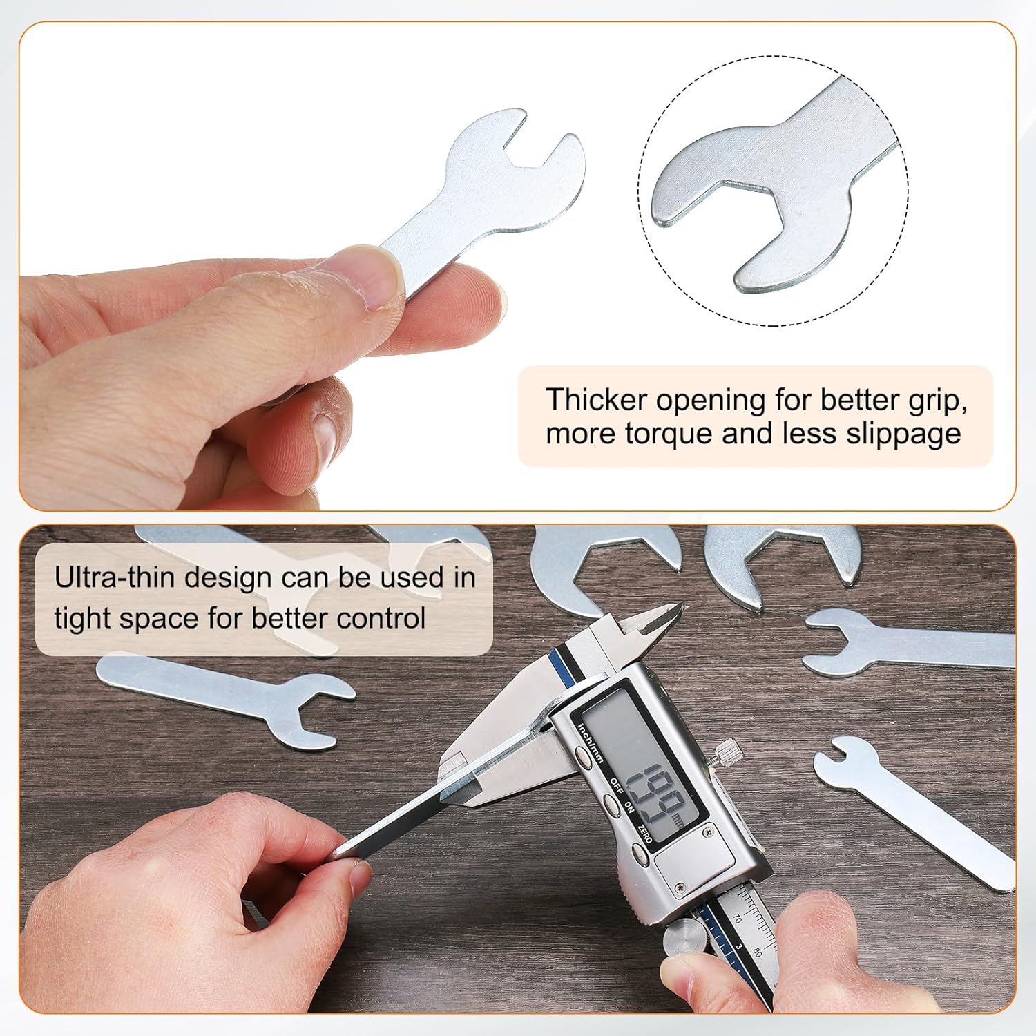 - Size - Open end: 10mm / 0.45"; Open outside width: 22.5mm / 0.87"; Total length: 70mm / 2.76"; Stem thickness: 1.5mm / 0.06"; Stem width: 11.3mm / 0.39"; Color: Silver-grey; Package includes: 10 x Single open-end wrenches. The open wrench set is thin enough to work on tight spots.