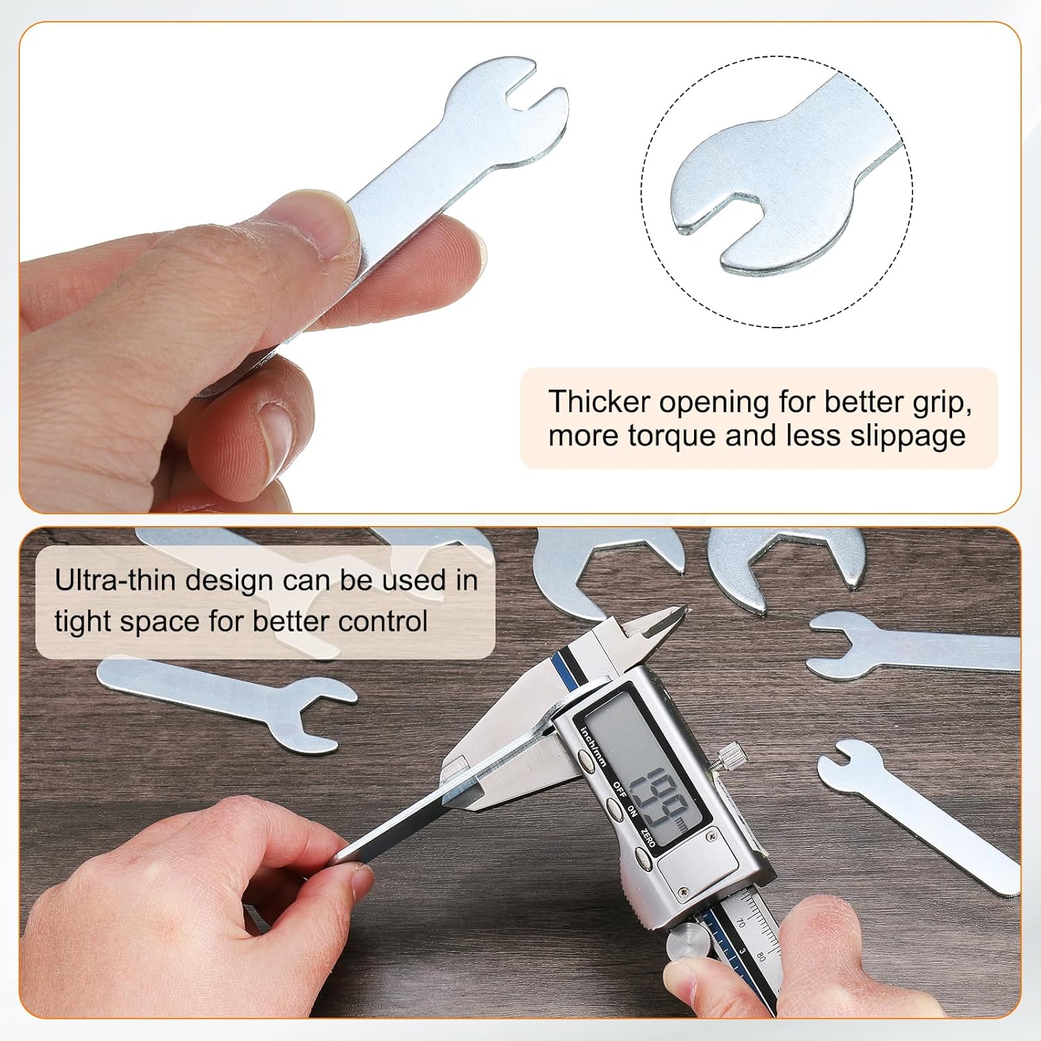- Size - Open end: 4mm / 0.16"; Open outside width: 17mm / 0.67"; Total length: 66mm / 2.6"; Stem thickness: 1.5mm / 0.06"; Stem width: 10mm / 0.39"; Color: Silver-grey; Package includes: 10 x Single open-end wrenches. The open wrench set is thin enough to work on tight spots.
