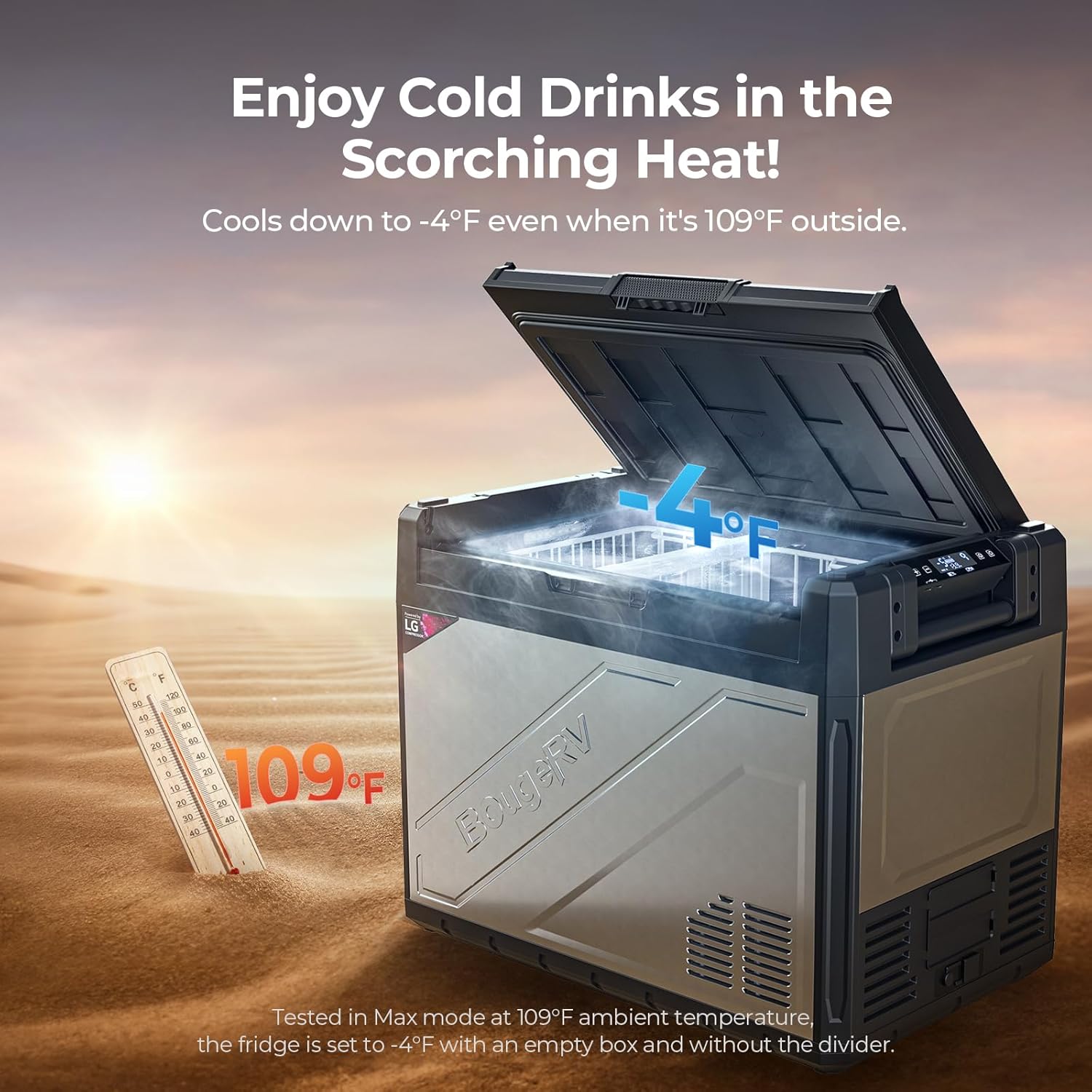 - Capable of Reaching -4β Even at 109β Ambient Temp: Using a 5.7cc compressor, the Rocky V2.0 69 quart portable refrigerator can cool down to -4β even in an ambient temp of 109β, ensuring that frozen goods stays as fresh as possible even in hot environments and let you have a better outdoor experience