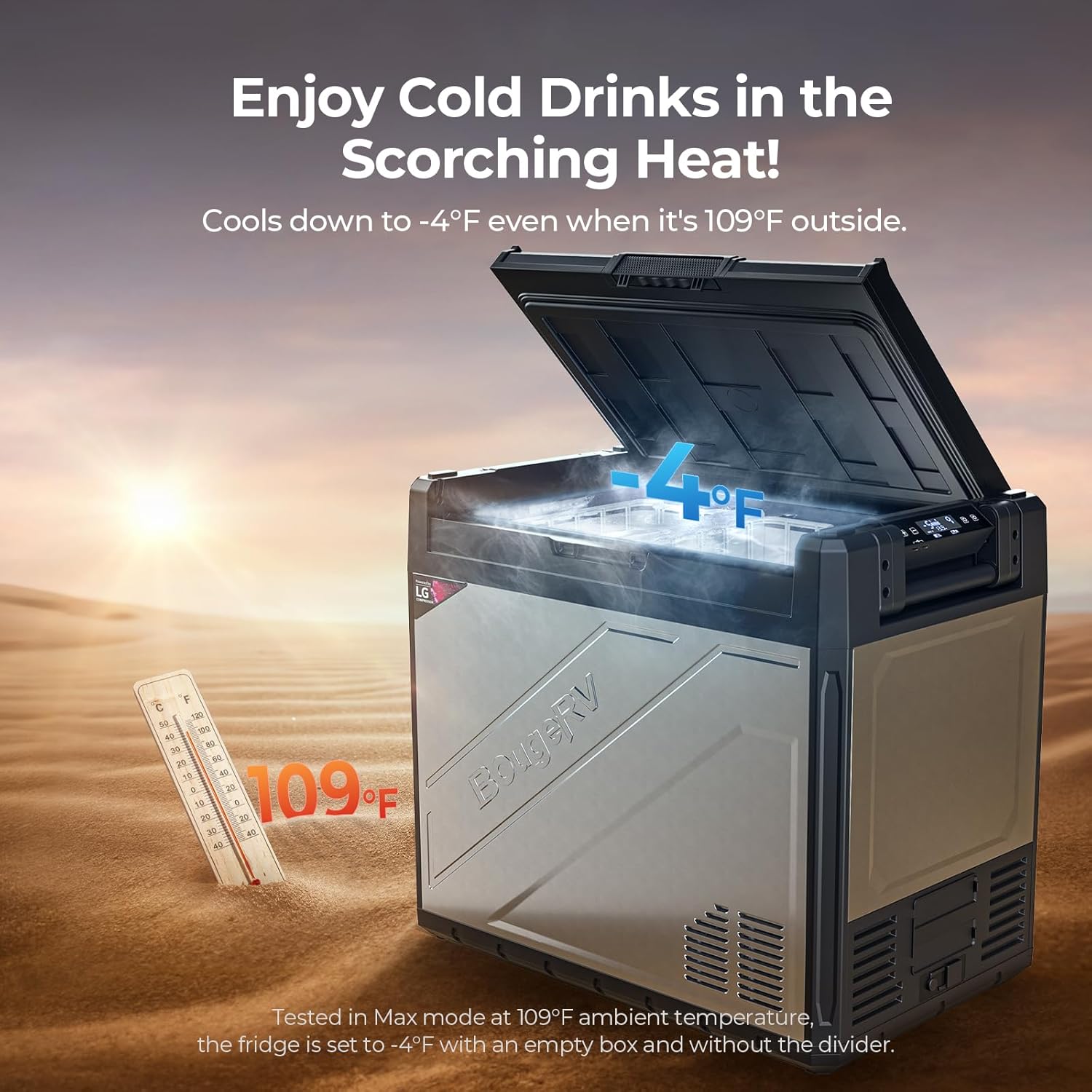 - Capable of Reaching -4β Even at 109β Ambient Temp: Using a 5.7cc LG compressor, the Rocky V2.0 81 quart portable refrigerator can cool down to -4β even in an ambient temp of 109β, ensuring that frozen goods stays as fresh as possible even in hot environments and let you have a better outdoor experience