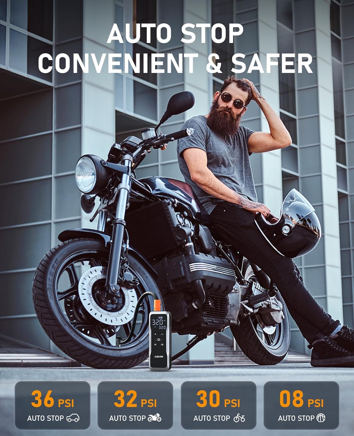 - Preset Pressure & Memory Function-Pre-calibrated modes for cars (36PSI), bikes (45PSI), motorcycles (32PSI), and balls (9PSI). You can start using it right away without any complex settings. Moreover, its memory function remembers the last used mode and parameters. So next time you use it, you don't need to adjust the tire pressure repeatedly, making it extremely user - friendly for regular users. ideal for households managing multiple vehicles.