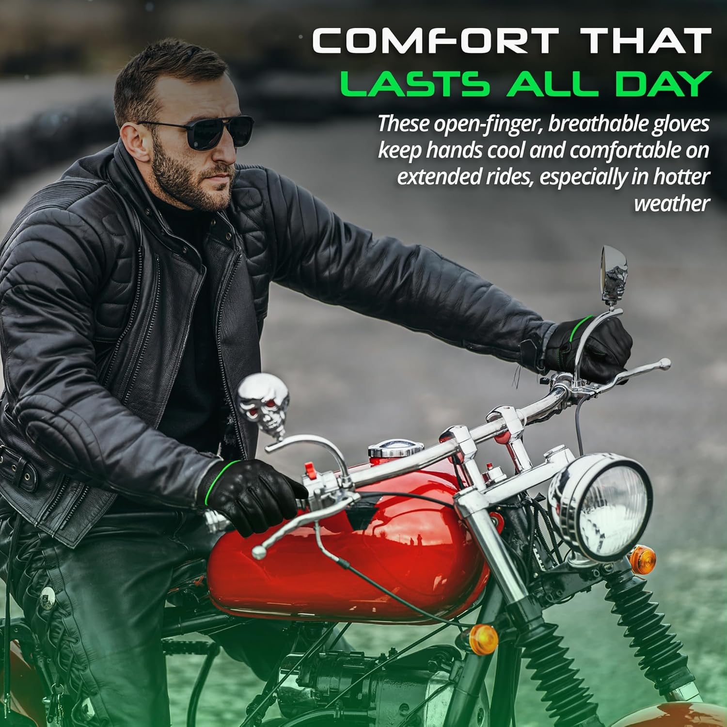- LEATHER MOTORCYCLE GLOVES - aaasportx Best black green Motorcycle Gloves are made of Genuine Leather. Our Lightweight Motorcycle Gloves ensures durability through a variety of situations. aaasportx Motorcycle Gloves for Men offer a high-quality, stylish, and durable finish that excludes sophistication and toughness on the road.