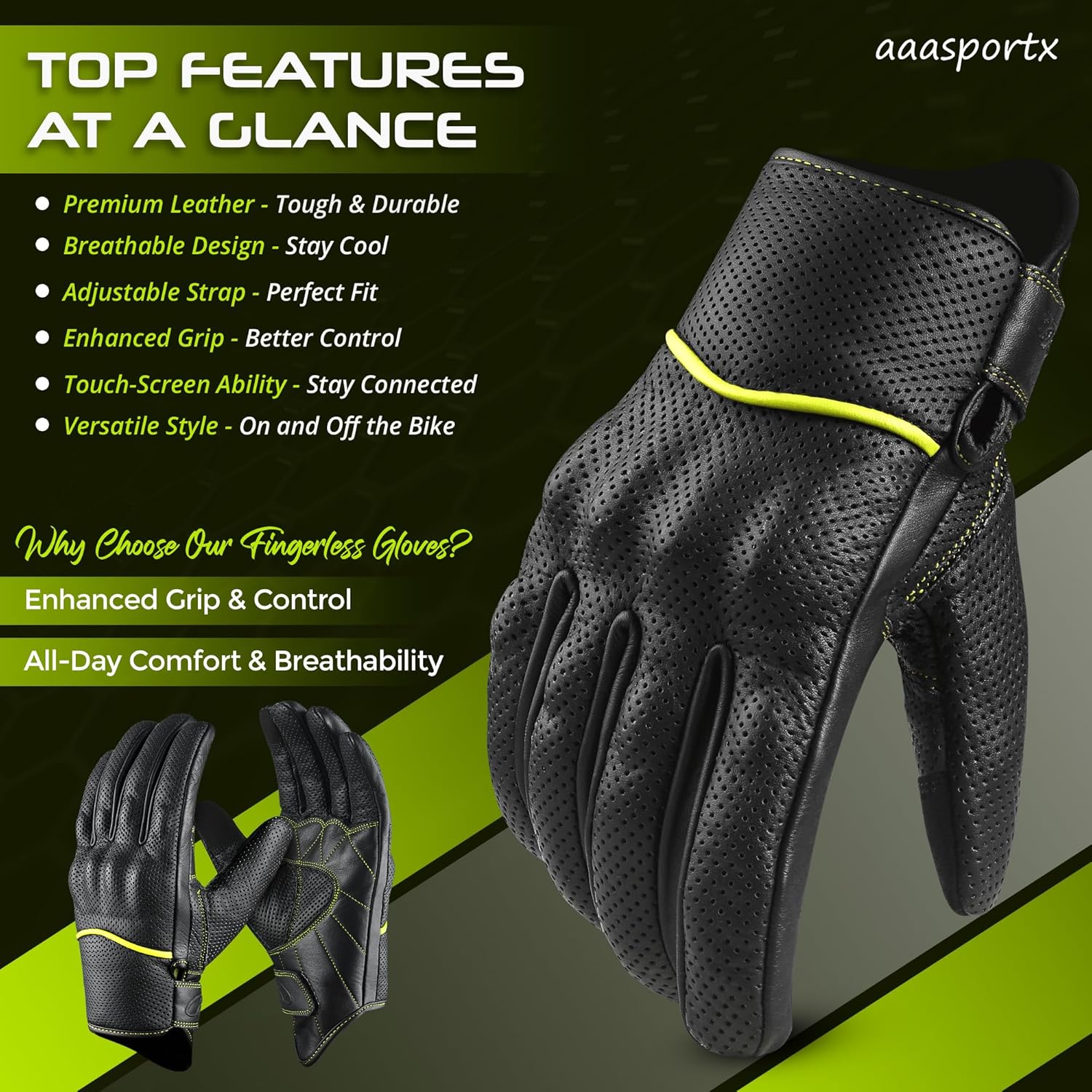 - LEATHER MOTORCYCLE GLOVES - aaasportx breathable perforated black yellow Motorcycle Gloves are made of premium quality Genuine Leather. Our Lightweight Motorcycle Gloves ensures durability through a variety of situations. aaasportx Motorcycle Gloves for Men offer a high-quality, stylish, and durable finish that excludes sophistication and toughness on the road.