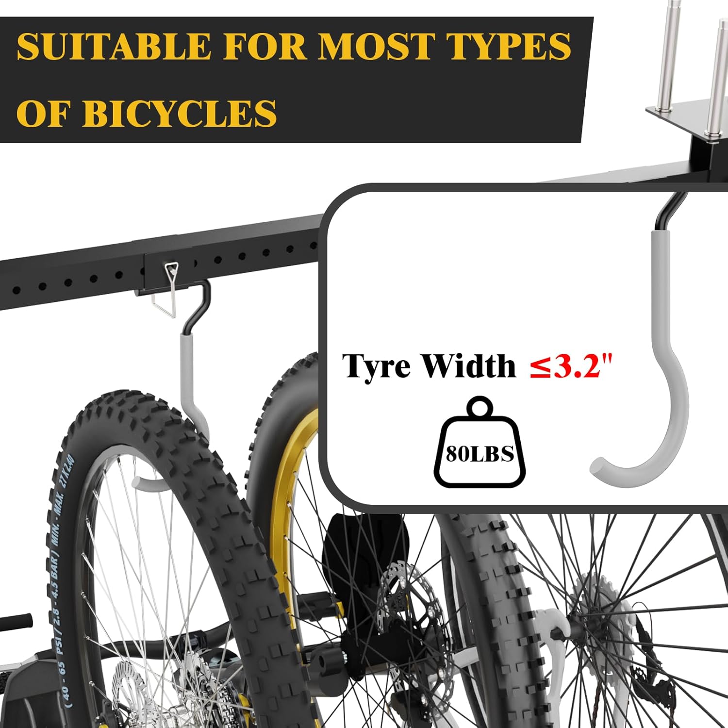 - ADJUSTABLE HOOK: The distance of all hooks can be adjusted according to the width of the bicycle, which can hang bicycles of different sizes to meet the needs of your family. Can store different types of bikes including road bikes, mountain bikes and children's bikes.