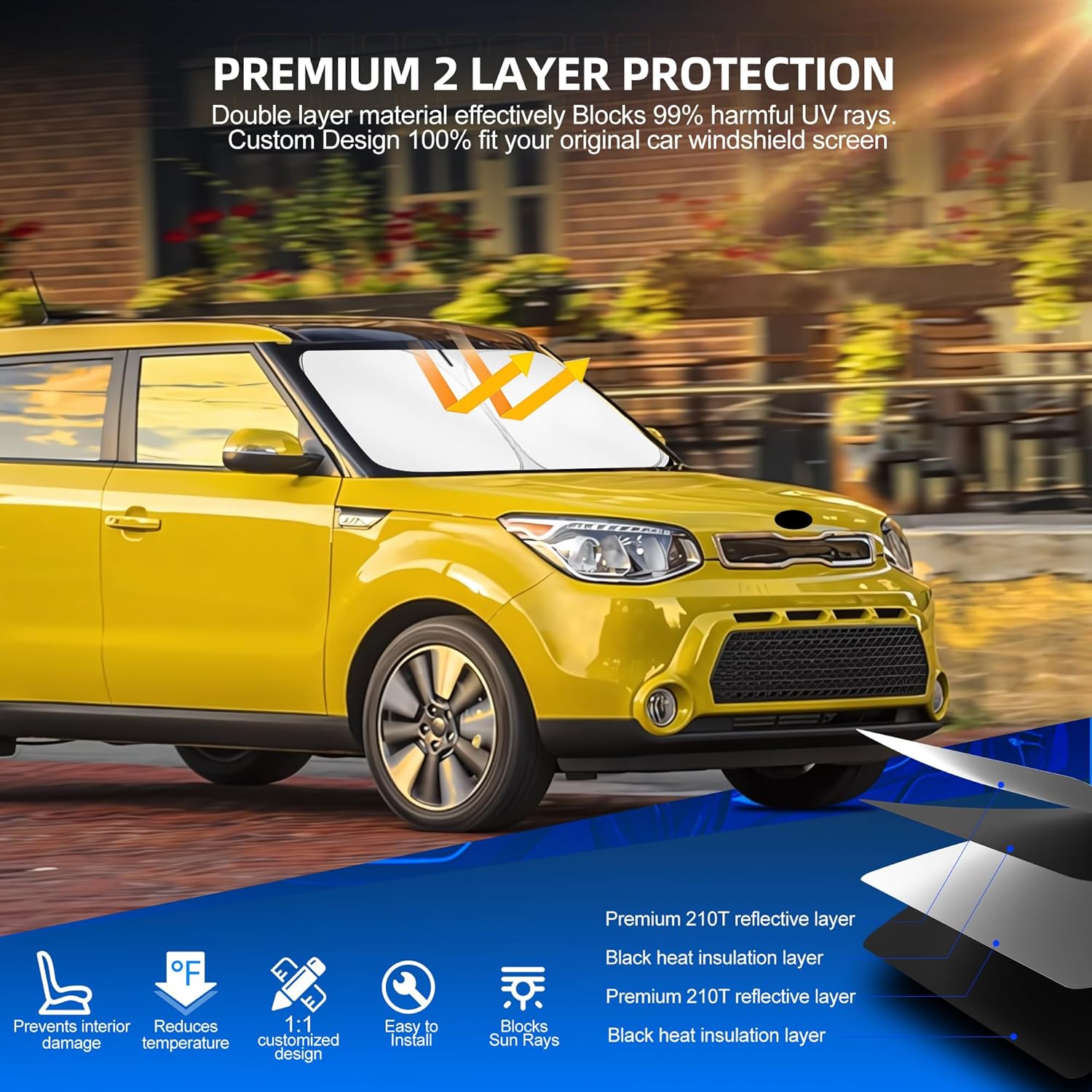 - ๐๐จ๐ฎ๐๐ฅ๐ ๐๐๐ฒ๐๐ซ๐ฌ ๐๐ซ๐จ๐ญ๐๐๐ญ๐ข๐จ๐ง: Our sunshade features a double-layer design with black heat-insulating layers on the inside and a silver reflective surface on the outside. Double insulation, and double protection, this custom-fit windshield shade blocks up to 131% of sunlight and UV rays,protect well your car interior accessories