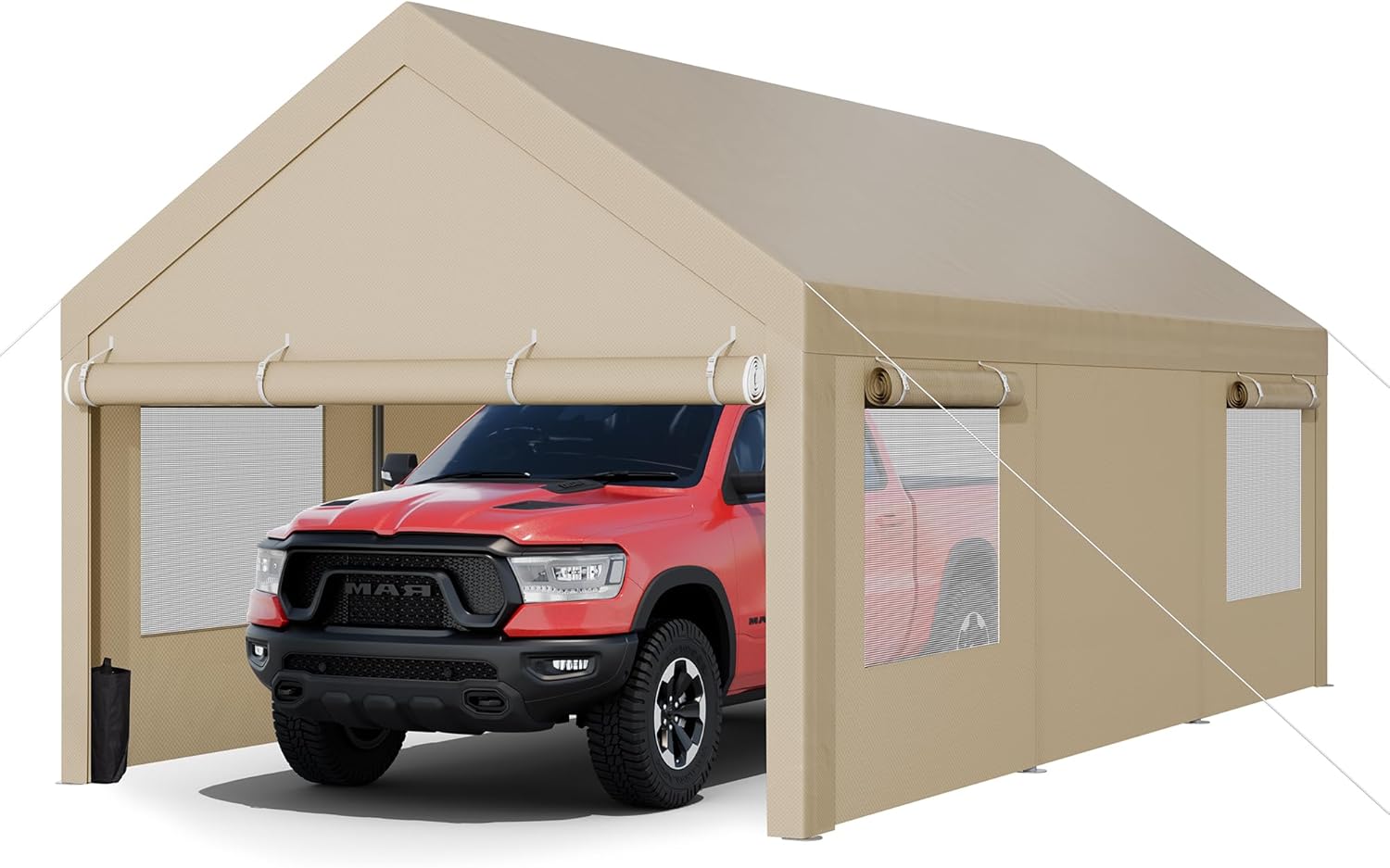 JY QAQA Carport, 10x20 FT Heavy Duty Carport with Removable Side Walls and Doors, Portable Garage with Roll-Up Window and Sandbags, Car Canopy with All-Season Tarp for Cars, Trucks, Boats, Khaki