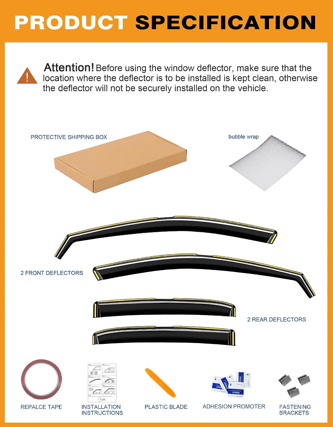 - ăFull-size Side Window DeflectorsăThis 4-piece set includes passenger, driver side rain guards that create a seamless look that protects you from sun rays, rain drops, and wind while youâre driving with the window down.