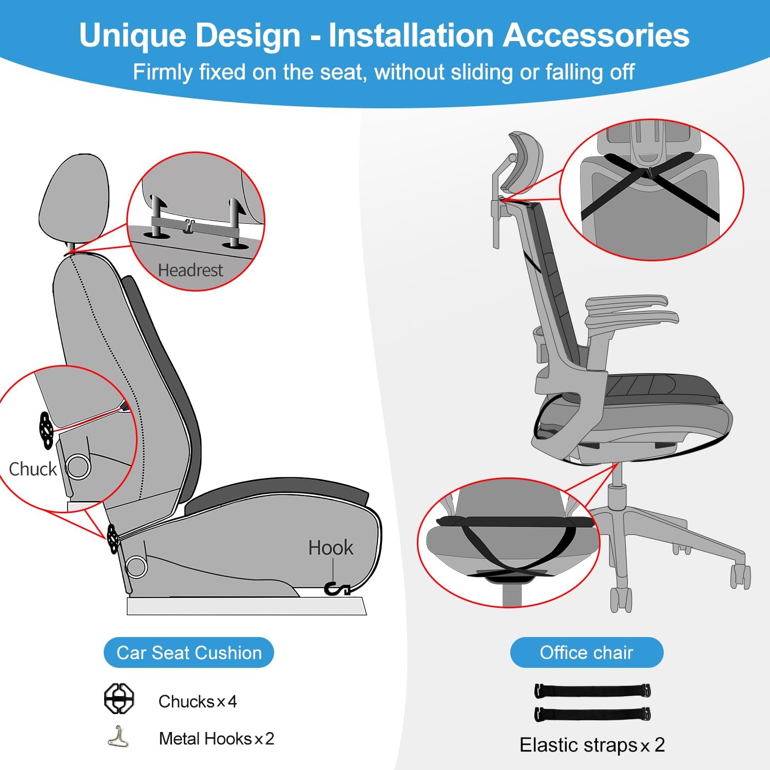 - Install Firmly without Sliding: This memory foam driver seat back support set comes with a non-slip rubber bottom and elastic straps to keep it firmly in place, solving the hassle of the seat cushion sliding around and falling off. The auto seat cushion set is very easy to install and can be used not only in the car but also in the office or home.