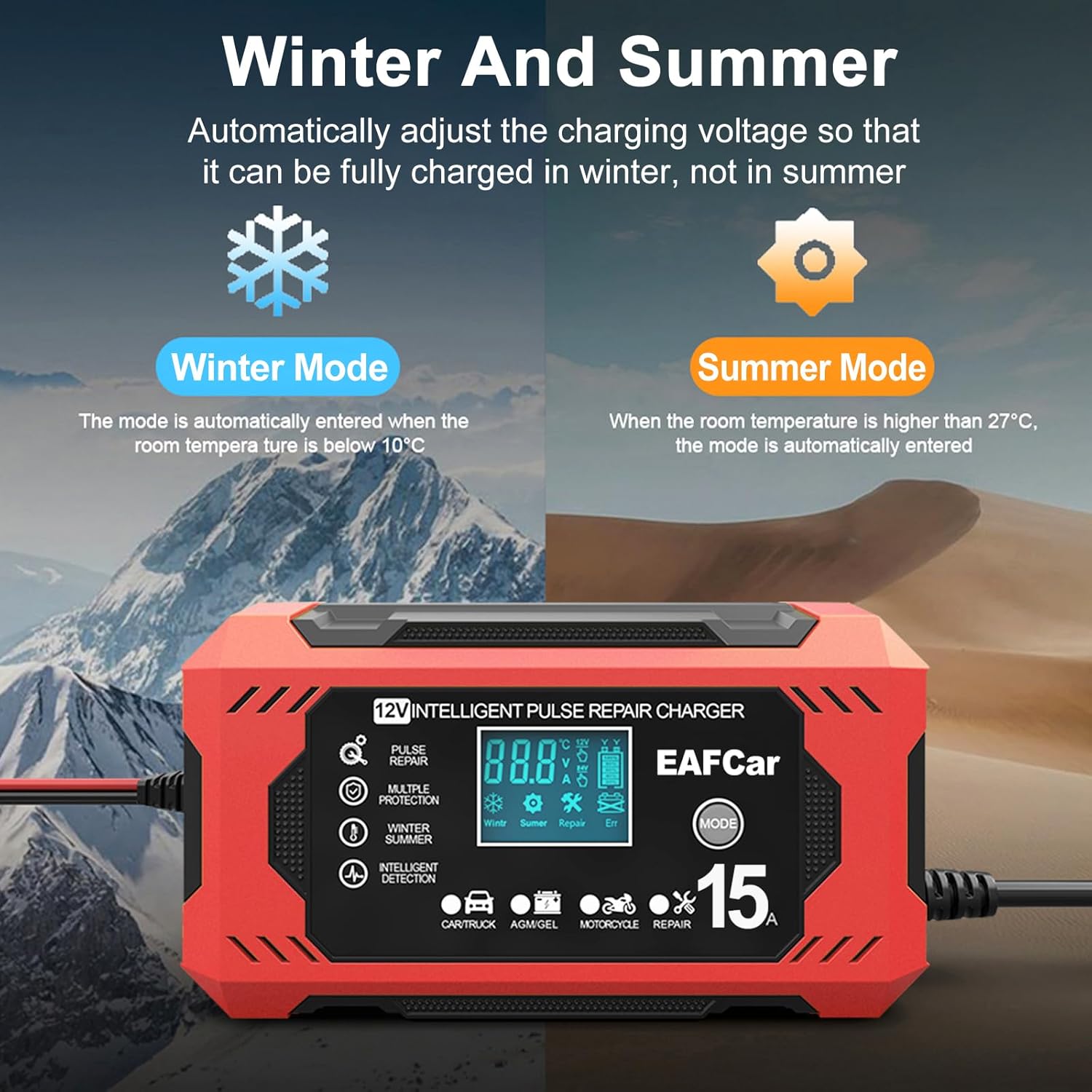 • 🔋【QUICK BATTERY CHARGER】12 volt 15-Amp quick car battery charger, can charge or repair all 12-volt lead-acid automotive, marine and deep-cycle batteries including AGM, GEL, SLA, Flooded in cars, trucks, SUVs, motorcycles, lawn mowers, boats, etc.