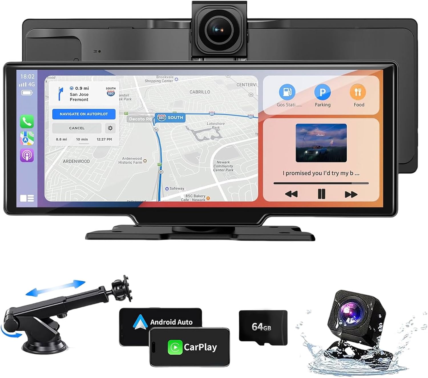 Wireless Car Stereo CarPlay Screen with 4K Dash Cam, 10.26" Apple Carplay & Android Auto Screen with 1080P Backup Camera/GPS Navigation/Mirror Link/Voice Control/Bluetooth