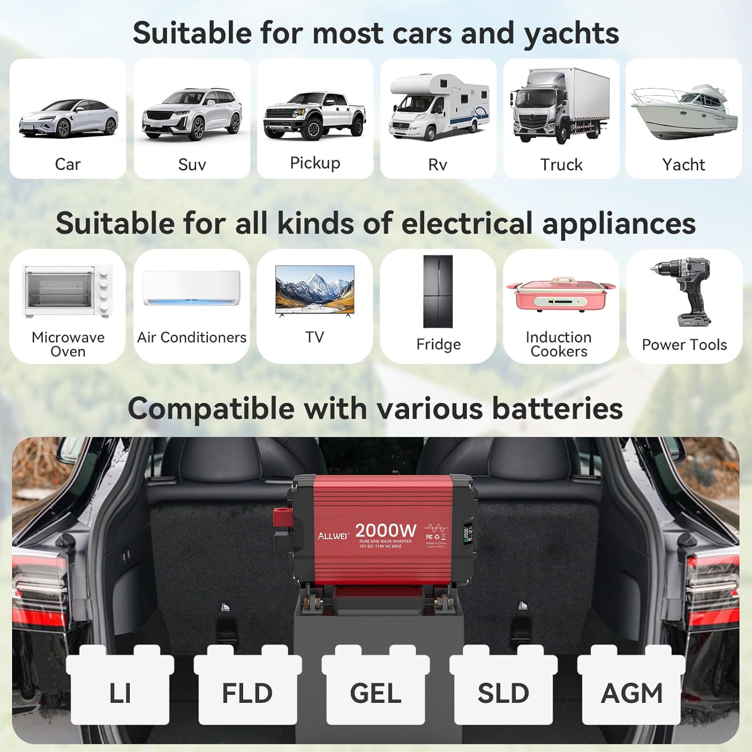- ăPure Sine Wave - Device Friendlyă: 2000w Pure Sine Wave Inverter provides utility-grade AC power with ultra-low no-load loss, perfect for RVs enthusiasts, truckers, campers; van Life, solar and off-grid setups. It powers sensitive devices (TV, laptop, power tools) and appliances (induction cookers, refrigerators, window air conditioners) smoothly, no annoying humming, protecting equipment and extending lifespanâjust like wall outlet electricity