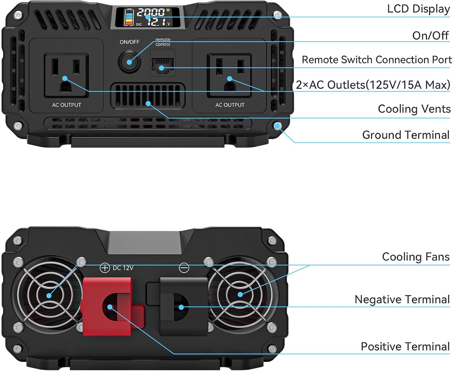 - ăUniversal 12V - Power Anywhereă: 2000 watt pure sine wave inverters is engineered for 12V batteries (vehicle start, RV auxiliary, deep-cycle), directly powers light loads (small appliances). Single U.S. outlet delivers maximum output power 1875W (125V/15A). A great setup for off grid or back up power systems, in addition to vehicle mounting. With versatile power solutions, supports parallel batteries and multi-battery switching, meeting temporary to long-term off-grid needs