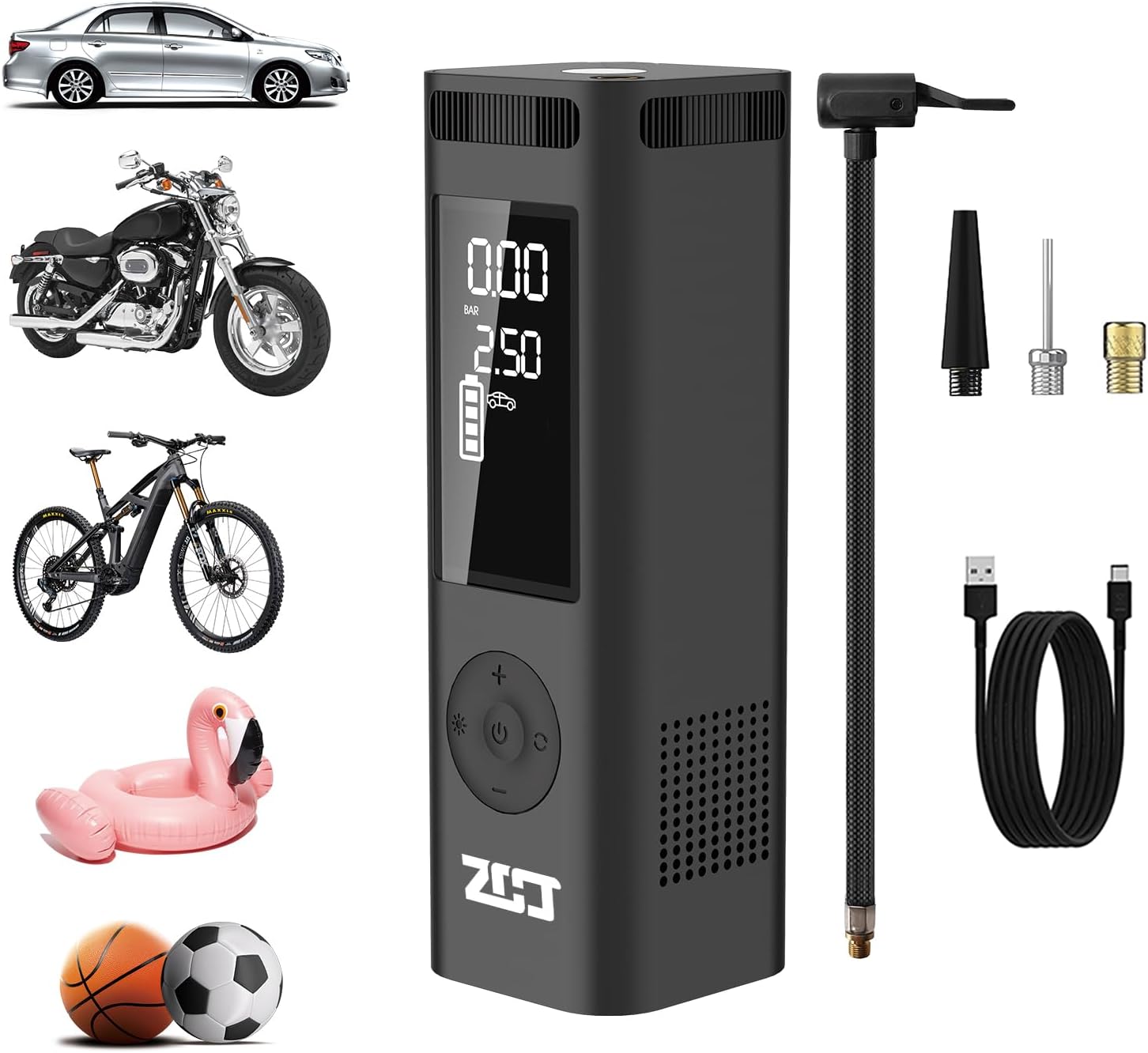 - Recommended Uses For Product : Ball Inflation, Bicycle Tire Inflation, Tire Inflation, Toy Inflation, battery powered air pump, bike pump portable, electric pump, motorcycle tire inflator, rechargeable air pump, tire air compressor Ball Inflation, Bicycle Tire Inflation, Tire Inflation, Toy Inflation, battery powered air pump, bike pump portable, electric pump, motorcycle tire in… See more