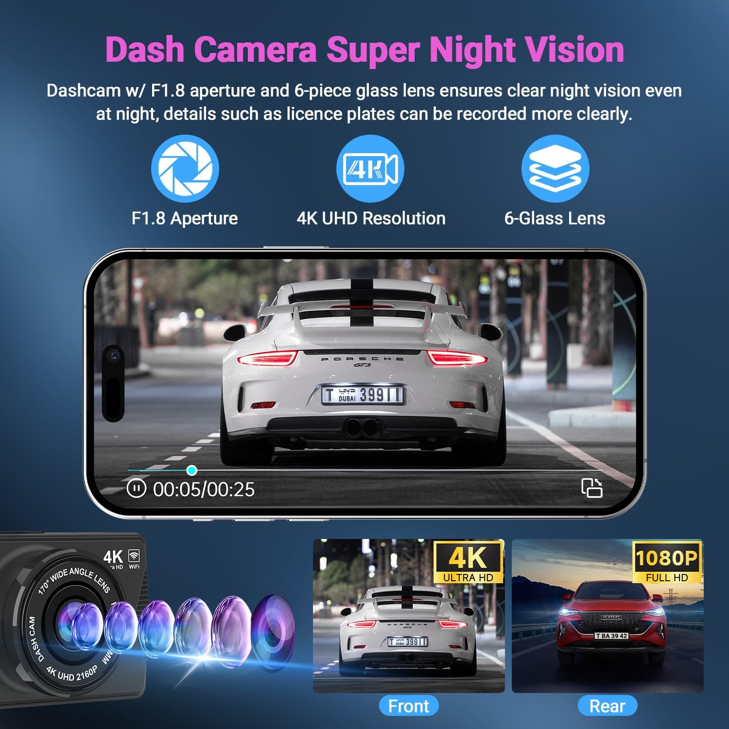 - 【4K+1080P DUAL RECORDING DASH CAM】- Dashcam record video in ultra-high definition 4K front+1080P rear.Dash cam front is equipped w/advanced Starvis sensor and six-glass lens.High-resolution recording capability helps you capture critical details like road signs license plates.To reduce blind spots,dash camera for cars features 170°wide-angle lens in front and 140°wide-angle lens in rear.Car camera is especially useful for preserving and presenting evidence in the event of accidents or collisions
