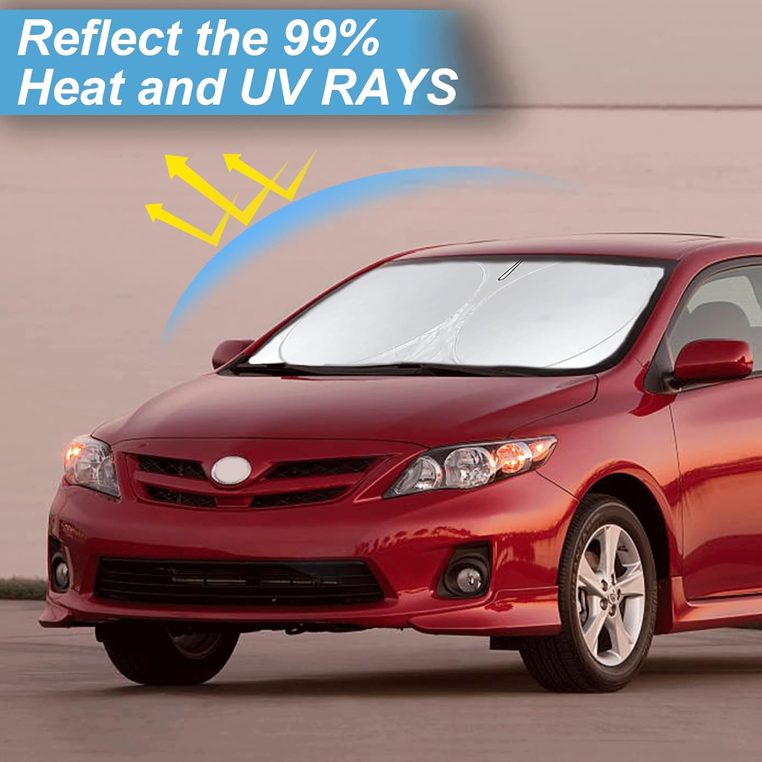 - [99% UV PROTECTION]-Extreme heat from UV rays over a period of time, can cause harm to your vehicles interior, leather seats, dashboard and electronics. Windshield sun shade made of 210T polyethylene microfiber, reflect 99% of ultraviolet rays-for maximum protection for your vehicle's interior, keeping your seats and steering wheel cool by blocking the sun's heat and harmful UV radiation rays, keep your cars interior cool and comfy, preventing fading and cracking of your dashboard.