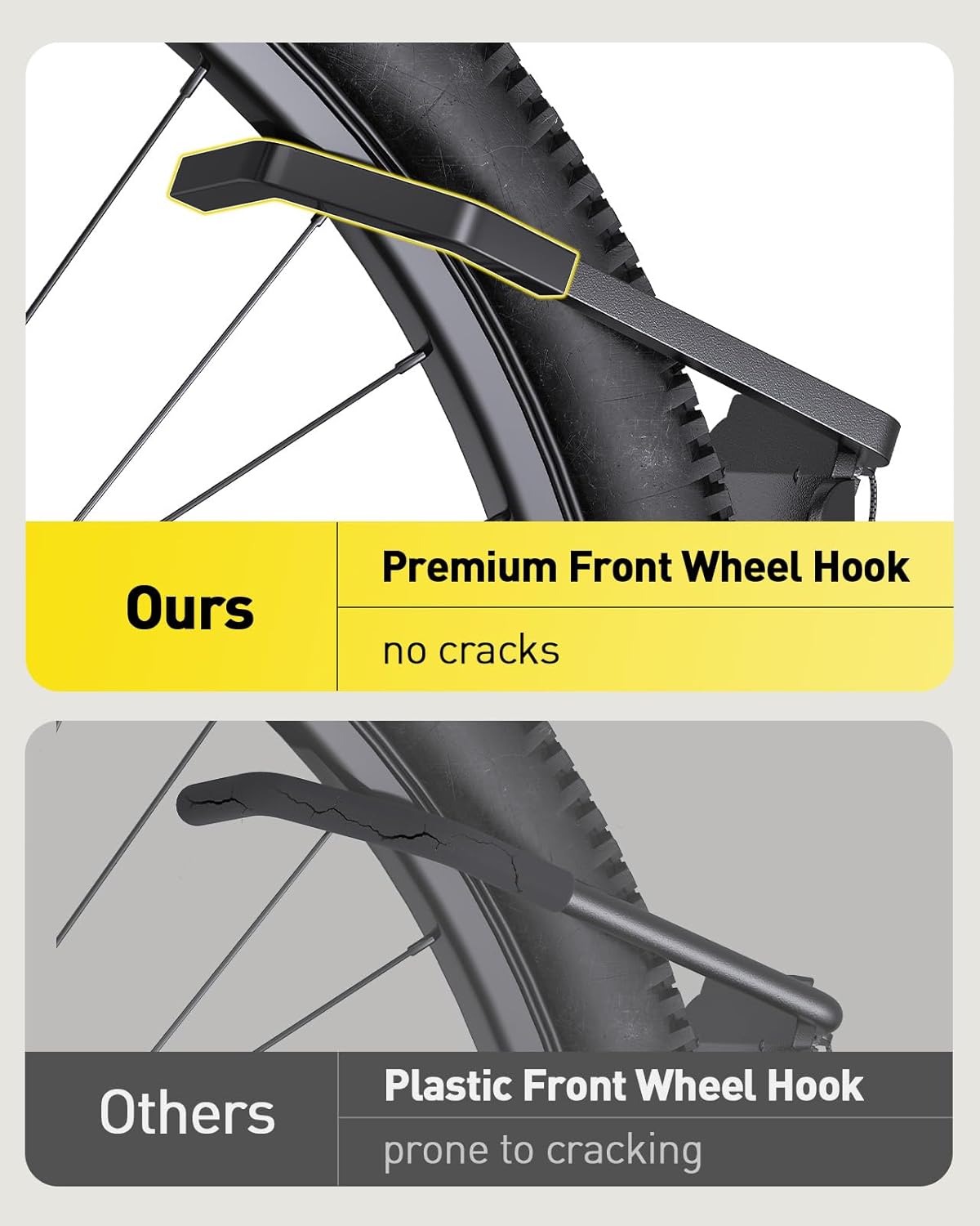 - 【No Grimy Walls】This garage bike rack wall mount features a corner rear wheel stand that keeps the rear wheel in place, so it doesn't shift while you position your bike – and doesn't touch the walls. It's a clean and hassle-free storage solution for your garage, apartment, home and shed.