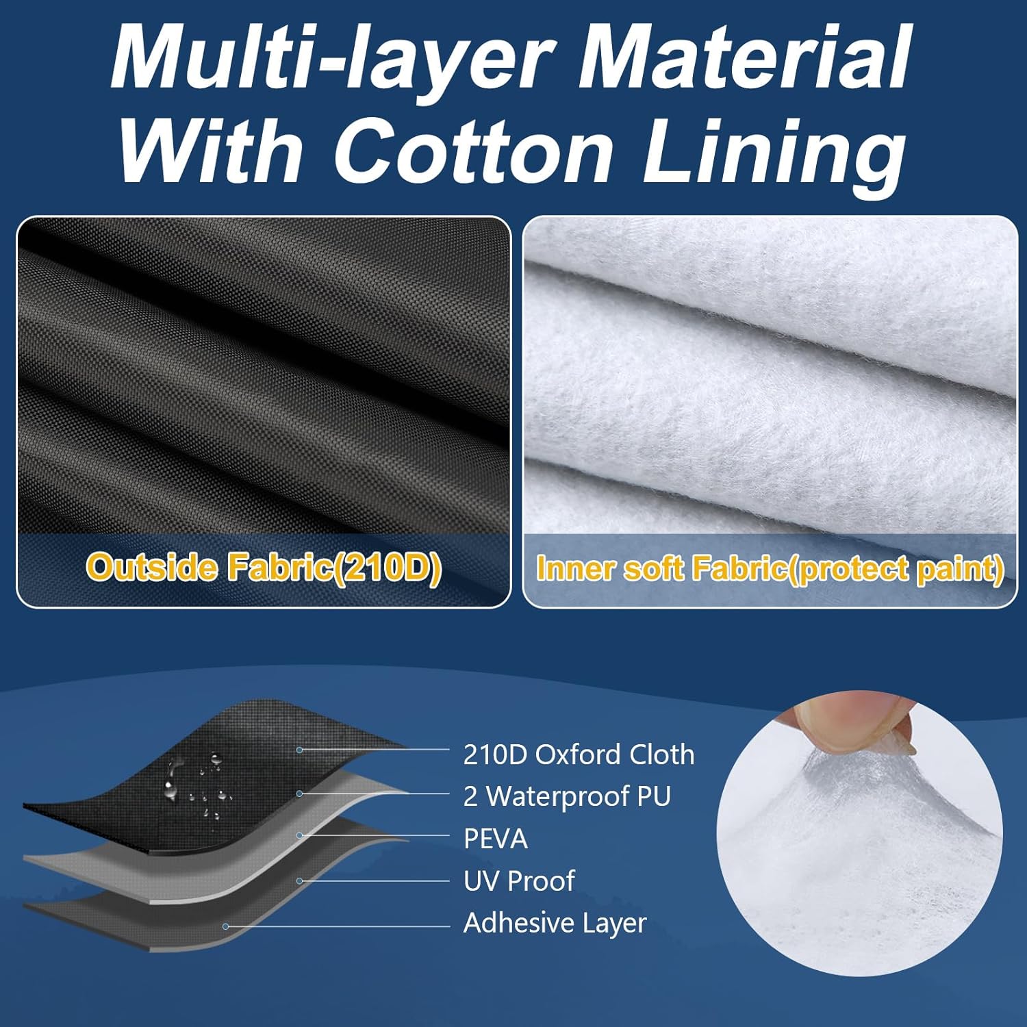 - ăAll-Weather ProtectionăMade black 210D Oxford cloth and cotton lining as material, ensuring its quality is tough, durable, and safe in strong wind conditions. Protects your vehicle and paint from rain, snow, sun, bird droppings, pollen, dust/dirt - suitable for all seasons.