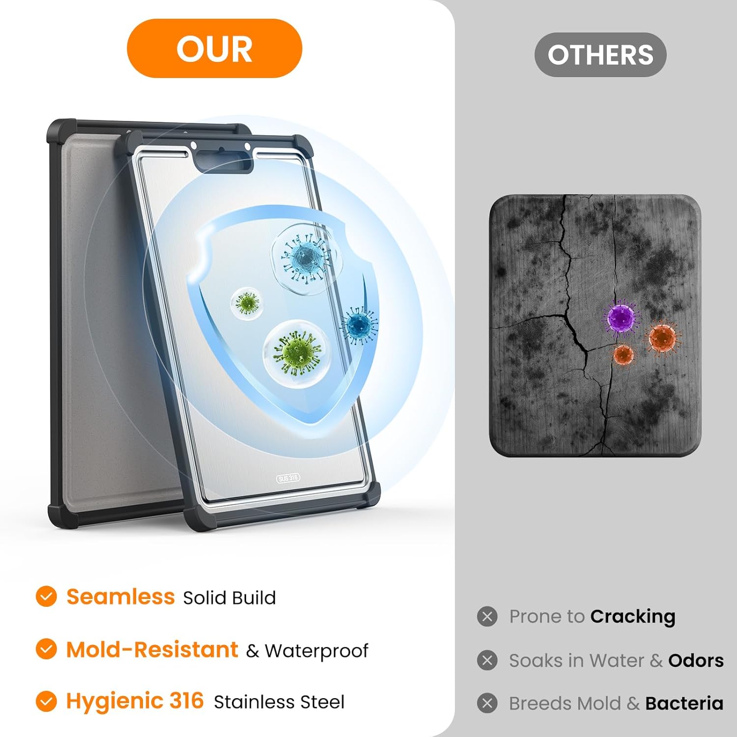- Durable & Long-lasting: Built to last, the 316stainless steel cutting board resists stains, scratches, and odors, ensuring long-term use. It’s an ideal choice for those who prefer durable cutting boards for kitchen that withstand daily wear and tear. Whether you're using it for regular meal prep or special occasions, it holds up to it all.